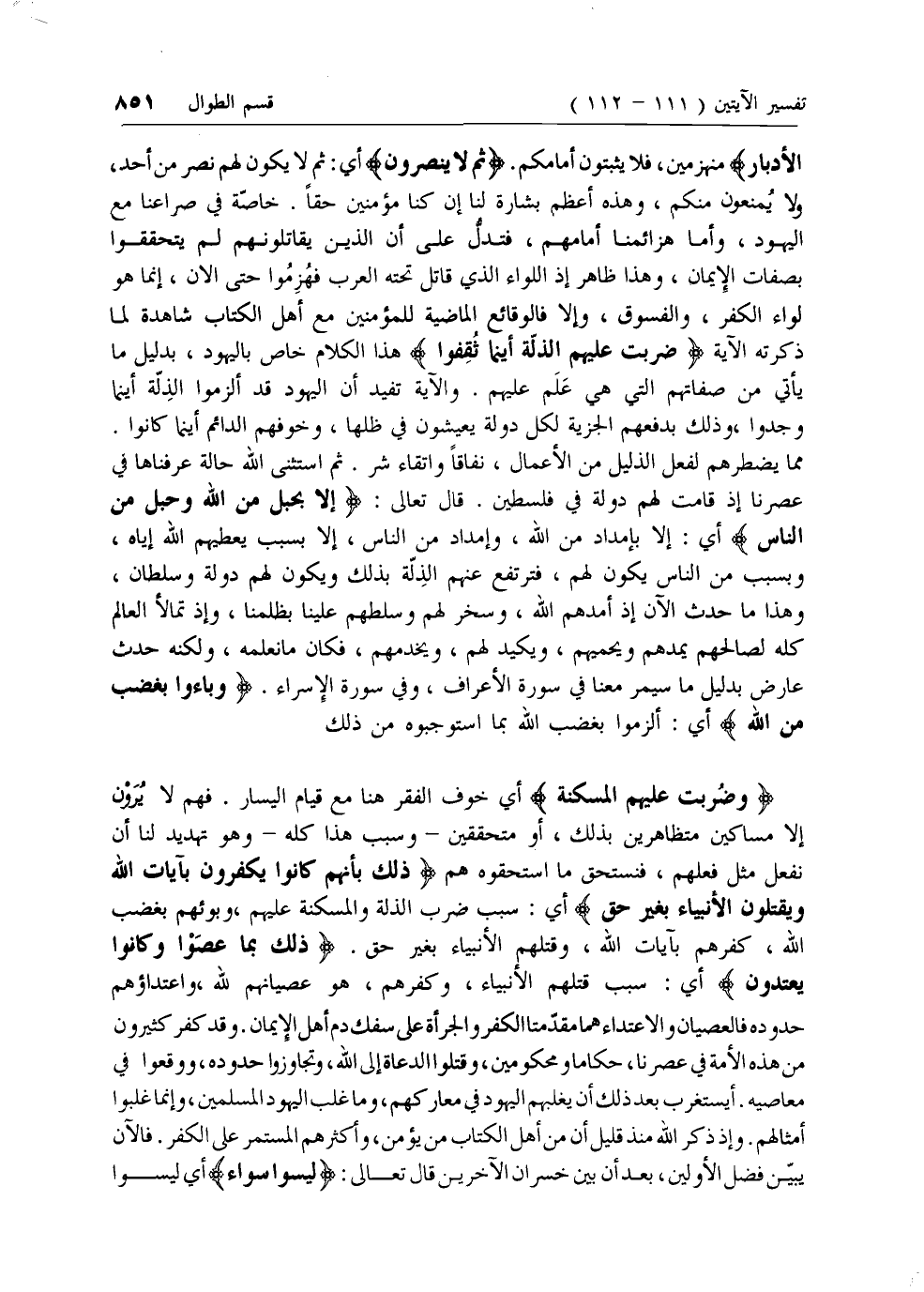 مما يضطرهم لفعل الذليل من الأعمال، نفاقا واتقاء شر. ثم استثنى الله حالة عرفناها في عصرنا إذ قامت لهم دولة في فلسطين. قال تعالى: إِلَّا بِحَبْلٍ مِنَ اللَّهِ وَحَبْلٍ مِنَ النَّاسِ أي: إلا بإمداد من الله، وإمداد من الناس، إلا بسبب يعطيهم الله إياه، وبسبب من الناس يكون لهم، فترتفع عنهم الذلة بذلك ويكون لهم دولة وسلطان، وهذا ما حدث الآن إذ أمدهم الله، وسخر لهم وسلطهم علينا بظلمنا، وإذ تمالأ العالم كله لصالحهم يمدهم ويحميهم، ويكيد لهم، ويخدمهم، فكان ما نعلمه، ولكنه حدث عارض بدليل ما سيمر معنا في سورة الأعراف، وفي سورة الإسراء. وَباؤُ بِغَضَبٍ مِنَ اللَّهِ أي: ألزموا بغضب الله بما استوجبوه من ذلك