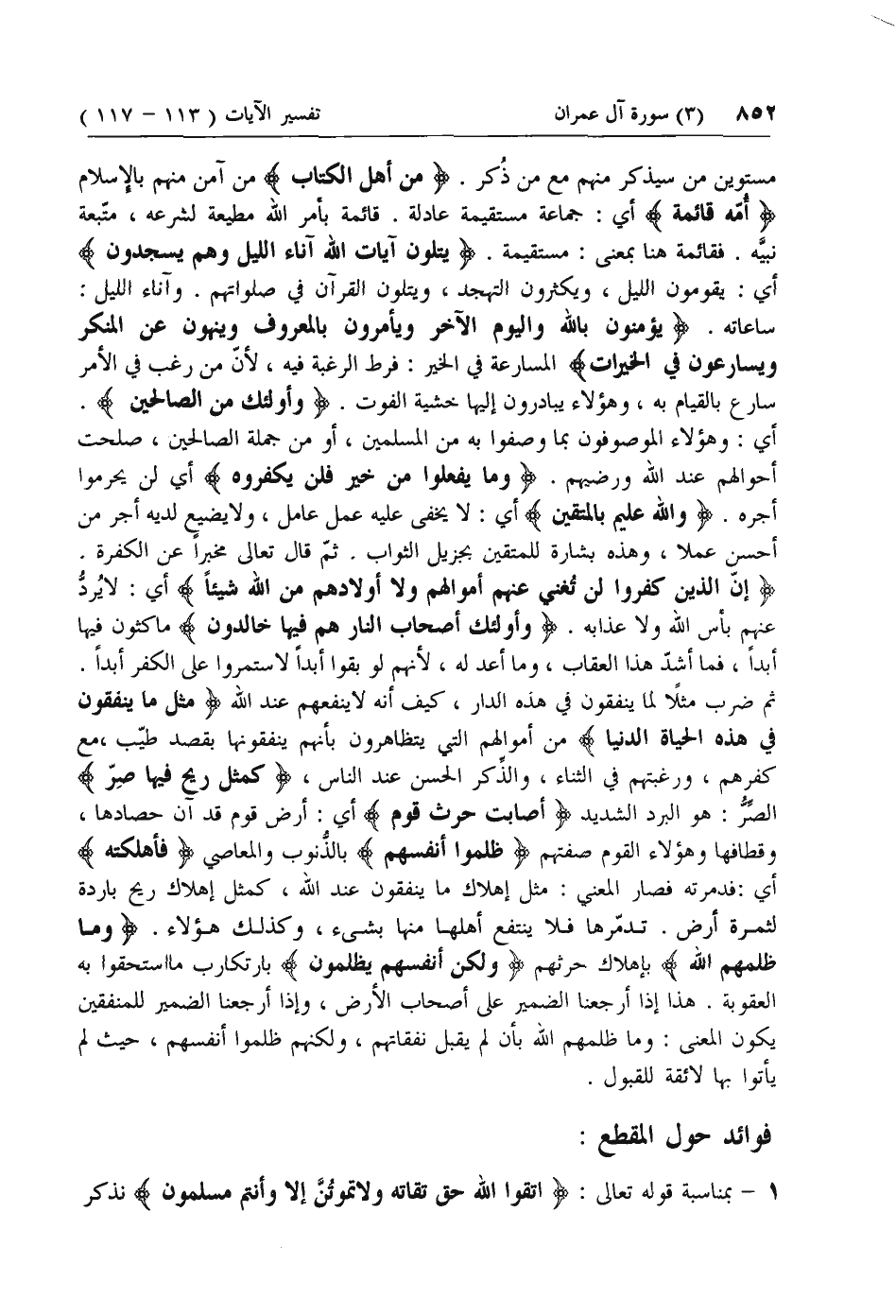 يُؤْمِنُونَ بِاللَّهِ وَالْيَوْمِ الْآخِرِ وَيَأْمُرُونَ بِالْمَعْرُوفِ وَيَنْهَوْنَ عَنِ الْمُنْكَرِ وَيُسارِعُونَ فِي الْخَيْراتِ المسارعة في الخير: فرط الرغبة فيه، لأن من رغب في الأمر سارع بالقيام به، وهؤلاء يبادرون إليها خشية الفوت. وَأُولئِكَ مِنَ الصَّالِحِينَ.