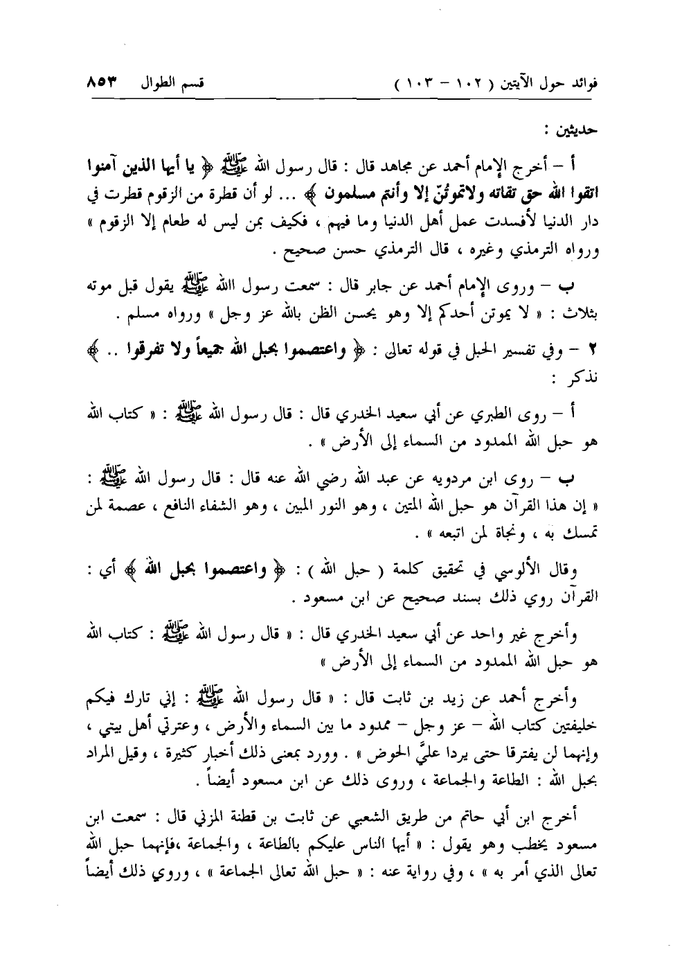 وأخرج أحمد عن زيد بن ثابت قال: «قال رسول الله صلى الله عليه وسلم: إني تارك فيكم خليفتين كتاب الله- عزّ وجل- ممدود ما بين السماء والأرض، وعترتي أهل بيتي، وإنهما لن يفترقا حتى يردا علي الحوض». وورد بمعنى ذلك أخبار كثيرة، وقيل المراد بحبل الله: الطاعة والجماعة، وروى ذلك عن ابن مسعود أيضا.