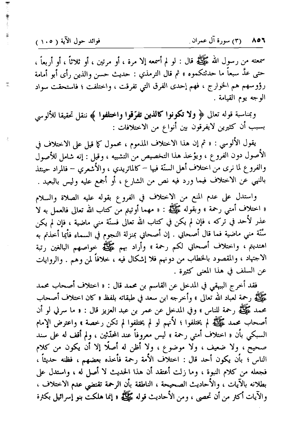 وبمناسبة قوله تعالى وَلا تَكُونُوا كَالَّذِينَ تَفَرَّقُوا وَاخْتَلَفُوا ننقل تحقيقا للآلوسي بسبب أن كثيرين لا يفرقون بين أنواع من الاختلافات: