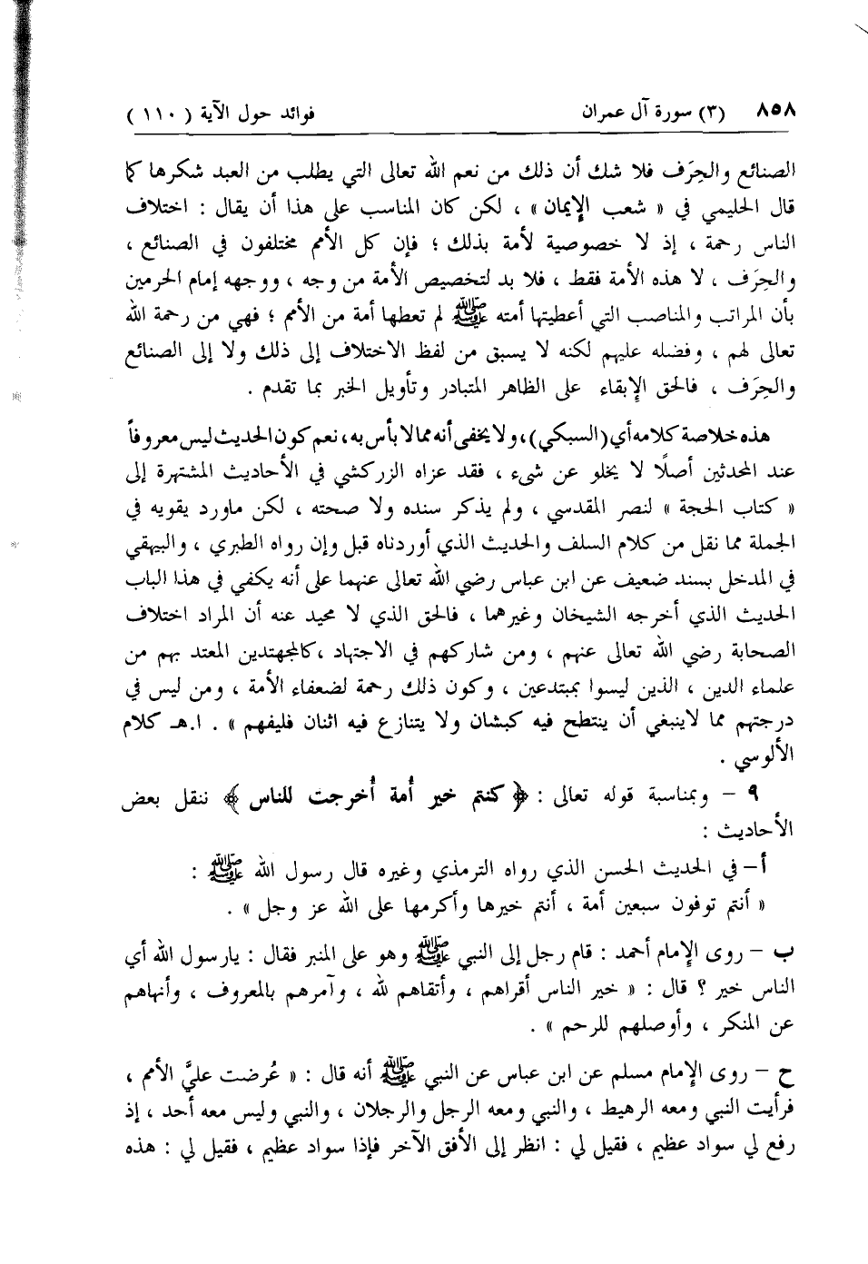 9 - وبمناسبة قوله تعالى: كُنْتُمْ خَيْرَ أُمَّةٍ أُخْرِجَتْ لِلنَّاسِ ننقل بعض الأحاديث:
