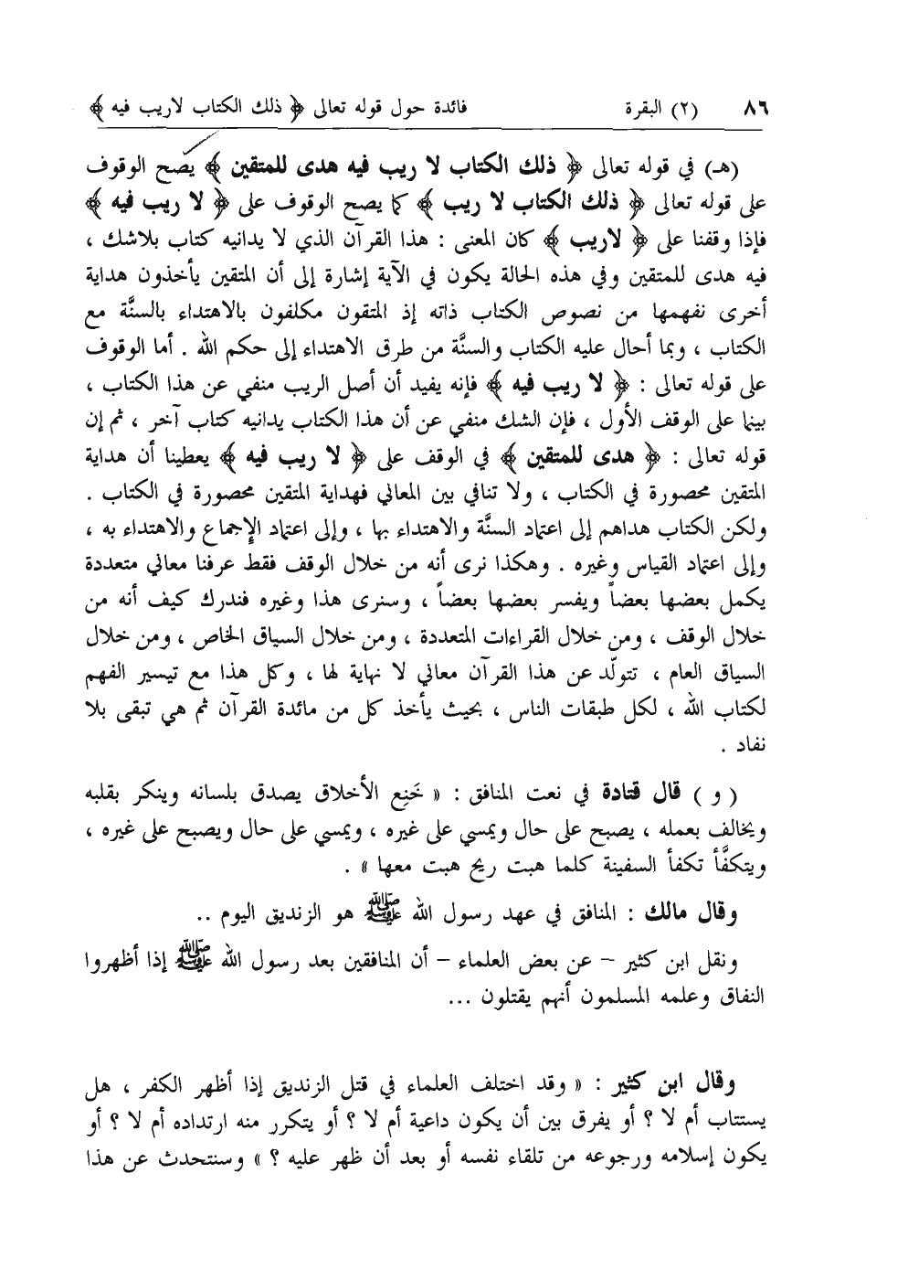 (هـ) في قوله تعالى ذلِكَ الْكِتابُ لا رَيْبَ فِيهِ هُدىً لِلْمُتَّقِينَ يصح الوقوف على قوله تعالى ذلِكَ الْكِتابُ لا رَيْبَ كما يصح الوقوف على لا رَيْبَ فِيهِ فإذا وقفنا على لا رَيْبَ كان المعنى: هذا القرآن الذي لا يدانيه كتاب بلا شك، فيه هدى للمتقين وفي هذه الحالة يكون في الآية إشارة إلى أن المتقين يأخذون هداية أخرى نفهمها من نصوص الكتاب ذاته إذ المتقون مكلفون بالاهتداء بالسنة مع الكتاب، وبما أحال عليه الكتاب والسنة من طرق الاهتداء إلى حكم الله. أما الوقوف على قوله تعالى: لا رَيْبَ فِيهِ فإنه يفيد أن أصل الريب منفي عن هذا الكتاب، بينما على الوقف الأول، فإن الشك منفي عن أن هذا الكتاب يدانيه كتاب آخر، ثم إن قوله تعالى: هُدىً لِلْمُتَّقِينَ في الوقف على لا رَيْبَ فِيهِ يعطينا أن هداية المتقين محصورة في الكتاب، ولا تنافي بين المعاني فهداية المتقين محصورة في الكتاب.