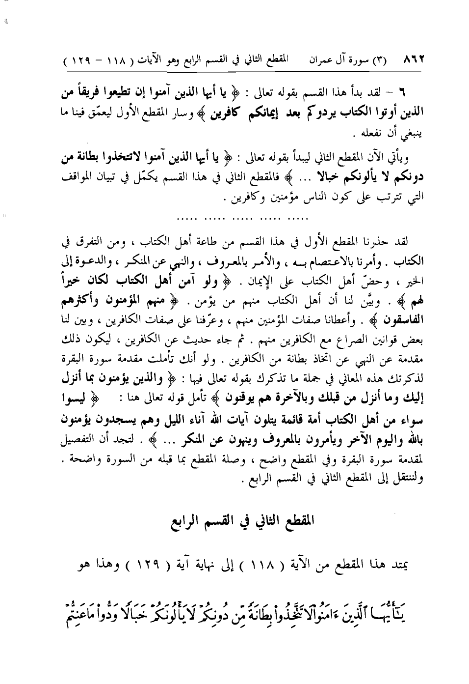 يمتد هذا المقطع من الآية (118) إلى نهاية آية (129) وهذا هو [سورة آل عمران (3): الآيات 118 الى 129]