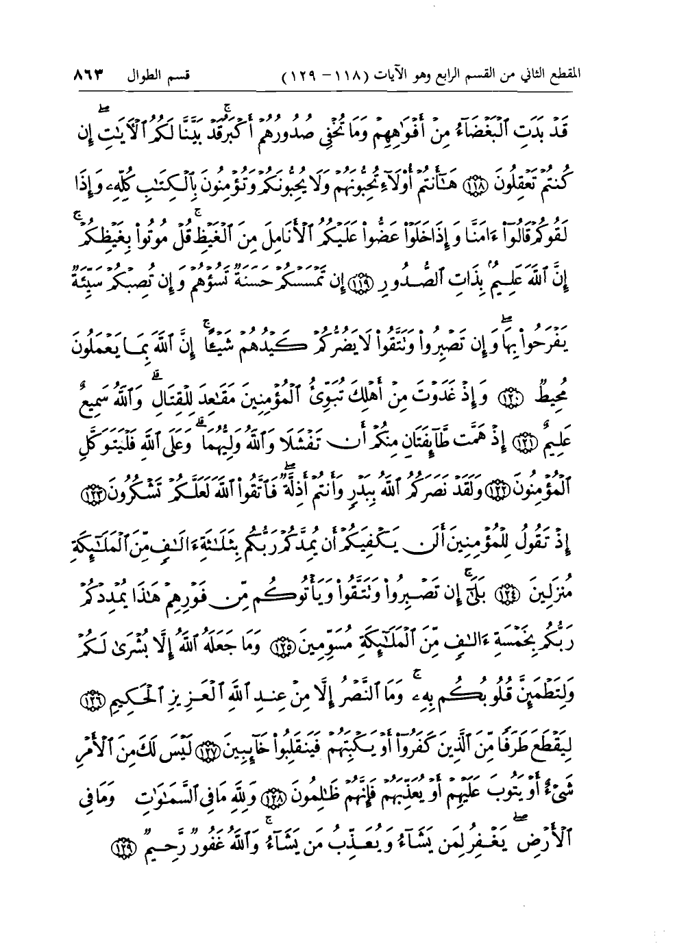 (118) ها أَنْتُمْ أُولاءِ تُحِبُّونَهُمْ وَلا يُحِبُّونَكُمْ وَتُؤْمِنُونَ بِالْكِتابِ كُلِّهِ وَإِذا لَقُوكُمْ قالُوا آمَنَّا وَإِذا خَلَوْا عَضُّوا عَلَيْكُمُ الْأَنامِلَ مِنَ الْغَيْظِ قُلْ مُوتُوا بِغَيْظِكُمْ إِنَّ اللَّهَ عَلِيمٌ بِذاتِ الصُّدُورِ (119) إِنْ تَمْسَسْكُمْ حَسَنَةٌ تَسُؤْهُمْ وَإِنْ تُصِبْكُمْ سَيِّئَةٌ يَفْرَحُوا بِها وَإِنْ تَصْبِرُوا وَتَتَّقُوا لا يَضُرُّكُمْ كَيْدُهُمْ شَيْئاً إِنَّ اللَّهَ بِما يَعْمَلُونَ مُحِيطٌ (120) وَإِذْ غَدَوْتَ مِنْ أَهْلِكَ تُبَوِّئُ الْمُؤْمِنِينَ مَقاعِدَ لِلْقِتالِ وَاللَّهُ سَمِيعٌ عَلِيمٌ (121) إِذْ هَمَّتْ طائِفَتانِ مِنْكُمْ أَنْ تَفْشَلا وَاللَّهُ وَلِيُّهُما وَعَلَى اللَّهِ فَلْيَتَوَكَّلِ الْمُؤْمِنُونَ (122)