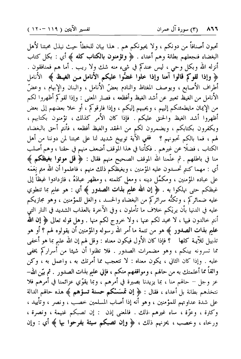 وَإِذا لَقُوكُمْ قالُوا آمَنَّا وَإِذا خَلَوْا عَضُّوا عَلَيْكُمُ الْأَنامِلَ مِنَ الْغَيْظِ الأنامل أطراف الأصابع، ويوصف المغتاظ والنادم بعض الأنامل، والبنان والإبهام، وعض الأنامل من الغيظ تعبير عن أشد الغيظ وأفظعه، فصار المعنى: وإذا لقوكم أظهروا لكم من الإيمان ما يطمئنكم إليهم، ويحببهم إليكم، وإذا فارقوكم، أو خلا بعضهم إلى بعض أظهروا أشد الغيظ والحنق عليكم. فإذا كان الأمر كذلك، تؤمنون بكتابهم، ويكفرون بكتابكم، ويضمرون لكم من الحقد والغيظ أفظعه، فأنتم أحق بالبغضاء لهم، فما بالكم تحبونهم؟ ففي الآية توبيخ شديد لنا على محبتنا لمن دوننا من أهل الكتاب، فضلا عن غيرهم. فكأننا في هذا الموقف أضعف منهم في حقنا، وهم أصلب منا في باطلهم. ثم علمنا الله الموقف الصحيح منهم فقال: قُلْ مُوتُوا بِغَيْظِكُمْ أي: مهما كنتم تحسدون عليه المؤمنين، وبغيظكم ذلك منهم، فاعلموا أن الله متم نعمه على عباده المؤمنين، ومكمل دينه، ومعل كلمته، ومظهر عباده، فازدادوا غيظا إلى غيظكم حتى تهلكوا به. إِنَّ اللَّهَ عَلِيمٌ بِذاتِ الصُّدُورِ أي: هو عليم بما تنطوي عليه ضمائركم، وتكنه سرائركم من البغضاء والحسد، والغل للمؤمنين، وهو مجازيكم عليه في الدنيا بأن يريكم خلاف ما تأملون، وفي الآخرة بالعذاب الشديد في النار التي أنتم خالدون فيها، لا محيد لكم عنها، ولا خروج لكم منها. وهل قوله تعالى إِنَّ اللَّهَ عَلِيمٌ بِذاتِ الصُّدُورِ هو من تتمة ما أمر الله رسوله والمؤمنين أن يقولوه لهم؟ أو هو تذييل للآية كلها؟ فإذا كان الأول فيكون معناه: وقل لهم إن الله عليم بما هو أخفى مما تسرونه بينكم، وهو مضمرات الصدور. فلا تظنوا أن شيئا من أسراركم يخفى عليه. وإذا كان الثاني، يكون معناه: لا تتعجب مما أمرتك به، واعمل به، وكن واثقا مما أعلمتك به من حالهم، ومواقفهم منكم، فإني عليم بذات الصدور.