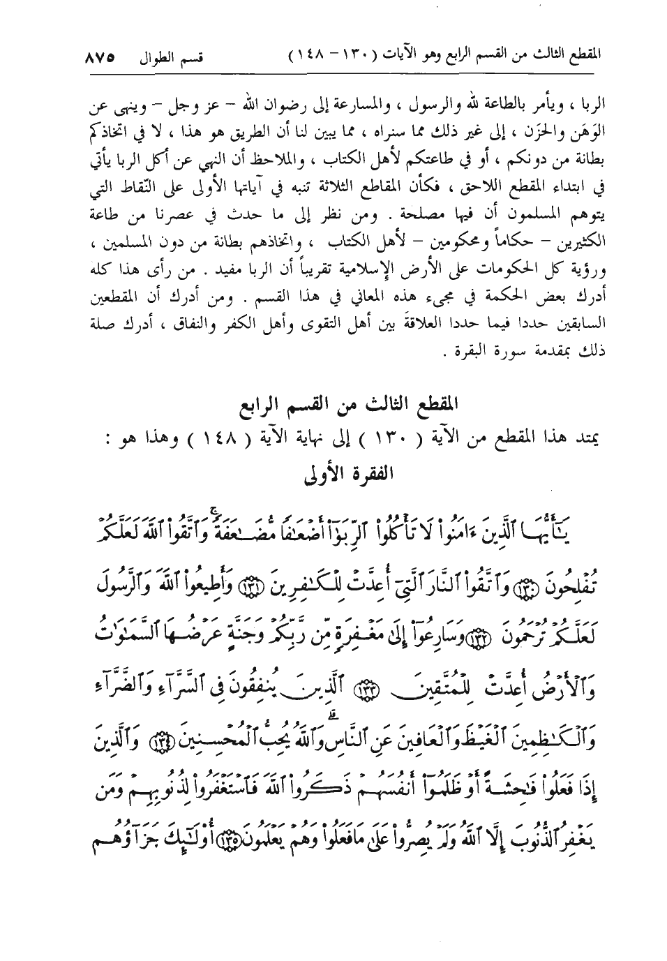 الربا، ويأمر بالطاعة لله والرسول، والمسارعة إلى رضوان الله- عزّ وجل- وينهى عن الوهن والحزن، إلى غير ذلك مما سنراه، مما يبين لنا أن الطريق هو هذا، لا في اتخاذكم بطانة من دونكم، أو في طاعتكم لأهل الكتاب، والملاحظ أن النهي عن أكل الربا يأتي في ابتداء المقطع اللاحق، فكأن المقاطع الثلاثة تنبه في آياتها الأولى على النقاط التي يتوهم المسلمون أن فيها مصلحة. ومن نظر إلى ما حدث في عصرنا من طاعة الكثيرين- حكاما ومحكومين- لأهل الكتاب، واتخاذهم بطانة من دون المسلمين، ورؤية كل الحكومات على الأرض الإسلامية تقريبا أن الربا مفيد. من رأى هذا كله أدرك بعض الحكمة في مجئ هذه المعاني في هذا القسم. ومن أدرك أن المقطعين السابقين حددا فيما حددا العلاقة بين أهل التقوى وأهل الكفر والنفاق، أدرك صلة ذلك بمقدمة سورة البقرة.