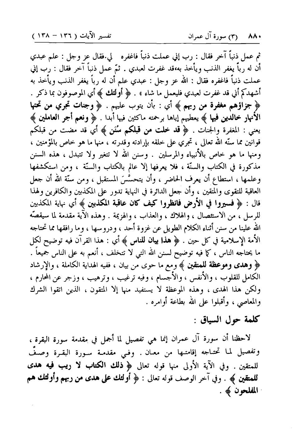 لاحظنا أن سورة آل عمران إنما هي تفصيل لما أجمل في مقدمة سورة البقرة، وتفصيل لما تحتاجه إقامتها من معان. وفي مقدمة سورة البقرة وصف للمتقين. وفي الآية الأولى منها قوله تعالى ذلِكَ الْكِتابُ لا رَيْبَ فِيهِ هُدىً لِلْمُتَّقِينَ. وفي آخر الوصف قوله تعالى: أُولئِكَ عَلى هُدىً مِنْ رَبِّهِمْ وَأُولئِكَ هُمُ الْمُفْلِحُونَ.