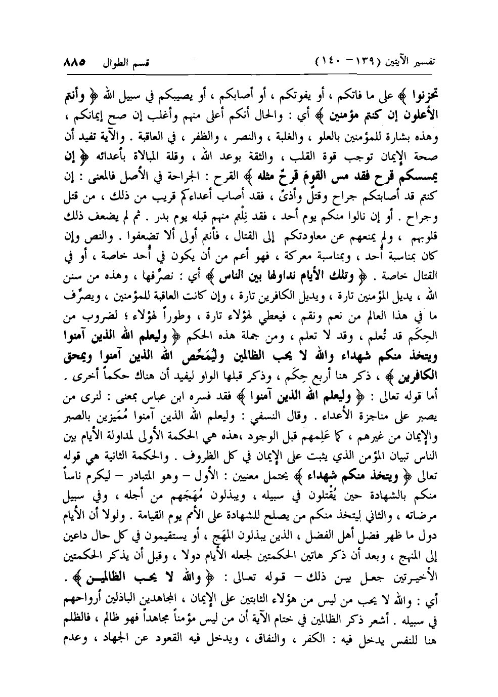 وجراح. أو إن نالوا منكم يوم أحد، فقد نلتم منهم قبله يوم بدر. ثم لم يضعف ذلك قلوبهم، ولم يمنعهم عن معاودتكم إلى القتال، فأنتم أولى ألا تضعفوا. والنص وإن كان بمناسبة أحد، وبمناسبة معركة، فهو أعم من أن يكون في أحد خاصة، أو في القتال خاصة. وَتِلْكَ الْأَيَّامُ نُداوِلُها بَيْنَ النَّاسِ أي: نصرفها، وهذه من سنن الله، يديل المؤمنين تارة، ويديل الكافرين تارة، وإن كانت العاقبة للمؤمنين، ويصرف ما في هذا العالم من نعم ونقم، فيعطي لهؤلاء تارة، وطورا لهؤلاء؛ لضروب من الحكم قد تعلم، وقد لا تعلم، ومن جملة هذه الحكم وَلِيَعْلَمَ اللَّهُ الَّذِينَ آمَنُوا وَيَتَّخِذَ مِنْكُمْ شُهَداءَ وَاللَّهُ لا يُحِبُّ الظَّالِمِينَ وَلِيُمَحِّصَ اللَّهُ الَّذِينَ آمَنُوا وَيَمْحَقَ الْكافِرِينَ، ذكر هنا أربع حكم، وذكر قبلها الواو ليفيد أن هناك حكما أخرى.