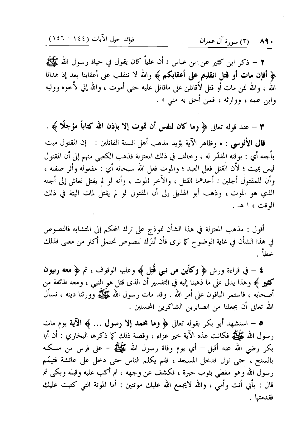 4 - في قراءة ورش وَكَأَيِّنْ مِنْ نَبِيٍّ قاتَلَ وعليها الوقوف، ثم مَعَهُ رِبِّيُّونَ كَثِيرٌ وهذا يدل على ما ذهبنا إليه في التفسير أن الذى قتل هو النبي، ومعه طائفة من أصحابه، فاستمر الباقون على أمر الله. وقد مات رسول الله صلى الله عليه وسلم وورثنا دينه، نسأل الله تعالى أن يجعلنا من الصابرين الشاكرين المحسنين.