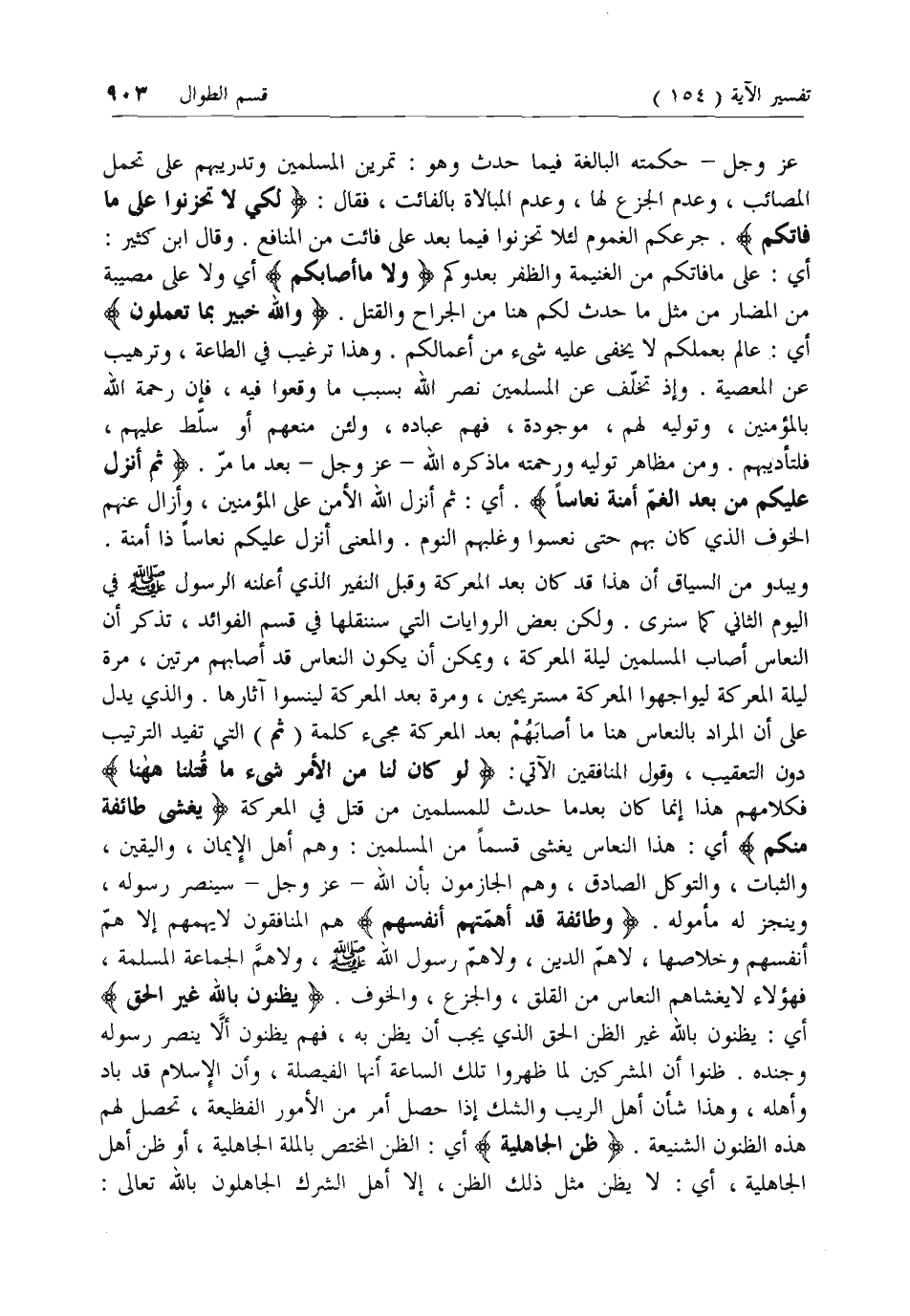المعركة لينسوا آثارها. والذي يدل على أن المراد بالنعاس هنا ما أصابهم بعد المعركة مجئ كلمة (ثم) التي تفيد الترتيب دون التعقيب، وقول المنافقين الآتي: لَوْ كانَ لَنا مِنَ الْأَمْرِ شَيْءٌ ما قُتِلْنا هاهُنا فكلامهم هذا إنما كان بعد ما حدث للمسلمين من قتل في المعركة يَغْشى طائِفَةً مِنْكُمْ أي: هذا النعاس يغشى قسما من المسلمين: وهم أهل الإيمان، واليقين، والثبات، والتوكل الصادق، وهم الجازمون بأن الله- عزّ وجل- سينصر رسوله، وينجز له مأموله. وَطائِفَةٌ قَدْ أَهَمَّتْهُمْ أَنْفُسُهُمْ هم المنافقون لا يهمهم إلا هم أنفسهم وخلاصها، لا هم الدين، ولا هم رسول الله صلى الله عليه وسلم، ولا هم الجماعة المسلمة، فهؤلاء لا يغشاهم النعاس من القلق، والجزع، والخوف. يَظُنُّونَ بِاللَّهِ غَيْرَ الْحَقِّ أي: يظنون بالله غير الظن الحق الذي يجب أن يظن به، فهم يظنون ألا ينصر رسوله وجنده. ظنوا أن المشركين لما ظهروا تلك الساعة أنها الفيصلة، وأن الإسلام قد باد وأهله، وهذا شأن أهل الريب والشك إذا حصل أمر من الأمور الفظيعة، تحصل لهم هذه الظنون الشنيعة. ظَنَّ الْجاهِلِيَّةِ أي: الظن المختص بالملة الجاهلية، أو ظن أهل الجاهلية، أي: لا يظن مثل ذلك الظن، إلا أهل الشرك الجاهلون بالله تعالى: