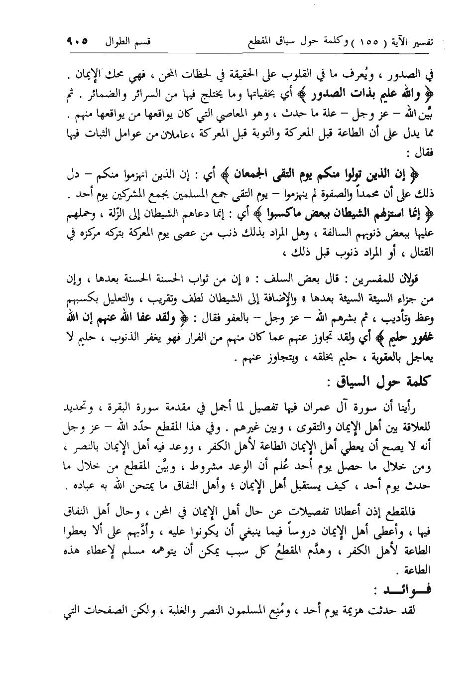 رأينا أن سورة آل عمران فيها تفصيل لما أجمل في مقدمة سورة البقرة، وتحديد للعلاقة بين أهل الإيمان والتقوى، وبين غيرهم. وفي هذا المقطع حدد الله- عزّ وجل أنه لا يصح أن يعطي أهل الإيمان الطاعة لأهل الكفر، ووعد فيه أهل الإيمان بالنصر، ومن خلال ما حصل يوم أحد علم أن الوعد مشروط، وبين المقطع من خلال ما حدث يوم أحد، كيف يستقبل أهل الإيمان؛ وأهل النفاق ما يمتحن الله به عباده.