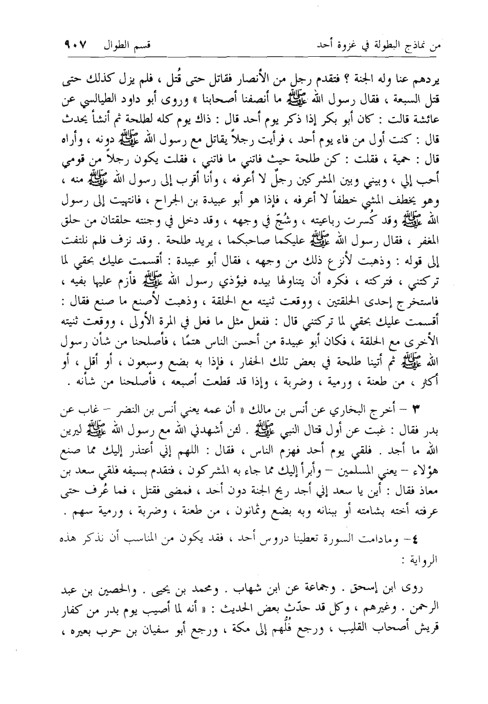يردهم عنا وله الجنة؟ فتقدم رجل من الأنصار فقاتل حتى قتل، فلم يزل كذلك حتى قتل السبعة، فقال رسول الله صلى الله عليه وسلم ما أنصفنا أصحابنا» وروى أبو داود الطيالسي عن عائشة قالت: كان أبو بكر إذا ذكر يوم أحد قال: ذاك يوم كله لطلحة ثم أنشأ يحدث قال: كنت أول من فاء يوم أحد، فرأيت رجلا يقاتل مع رسول الله صلى الله عليه وسلم دونه، وأراه قال: حمية، فقلت: كن طلحة حيث فاتني ما فاتني، فقلت يكون رجلا من قومي أحب إلي، وبيني وبين المشركين رجل لا أعرفه، وأنا أقرب إلى رسول الله صلى الله عليه وسلم منه، وهو يخطف المشي خطفا لا أعرفه، فإذا هو أبو عبيدة بن الجراح، فانتهيت إلى رسول الله صلى الله عليه وسلم وقد كسرت رباعيته، وشج في وجهه، وقد دخل في وجنته حلقتان من حلق المغفر، فقال رسول الله صلى الله عليه وسلم عليكما صاحبكما، يريد طلحة. وقد نزف فلم نلتفت إلى قوله: وذهبت لأنزع ذلك من وجهه، فقال أبو عبيدة: أقسمت عليك بحقي لما تركتني، فتركته، فكره أن يتناولها بيده فيؤذي رسول الله صلى الله عليه وسلم فأزم عليها بفيه، فاستخرج إحدى الحلقتين، ووقعت ثنيته مع الحلقة، وذهبت لأصنع ما صنع فقال: