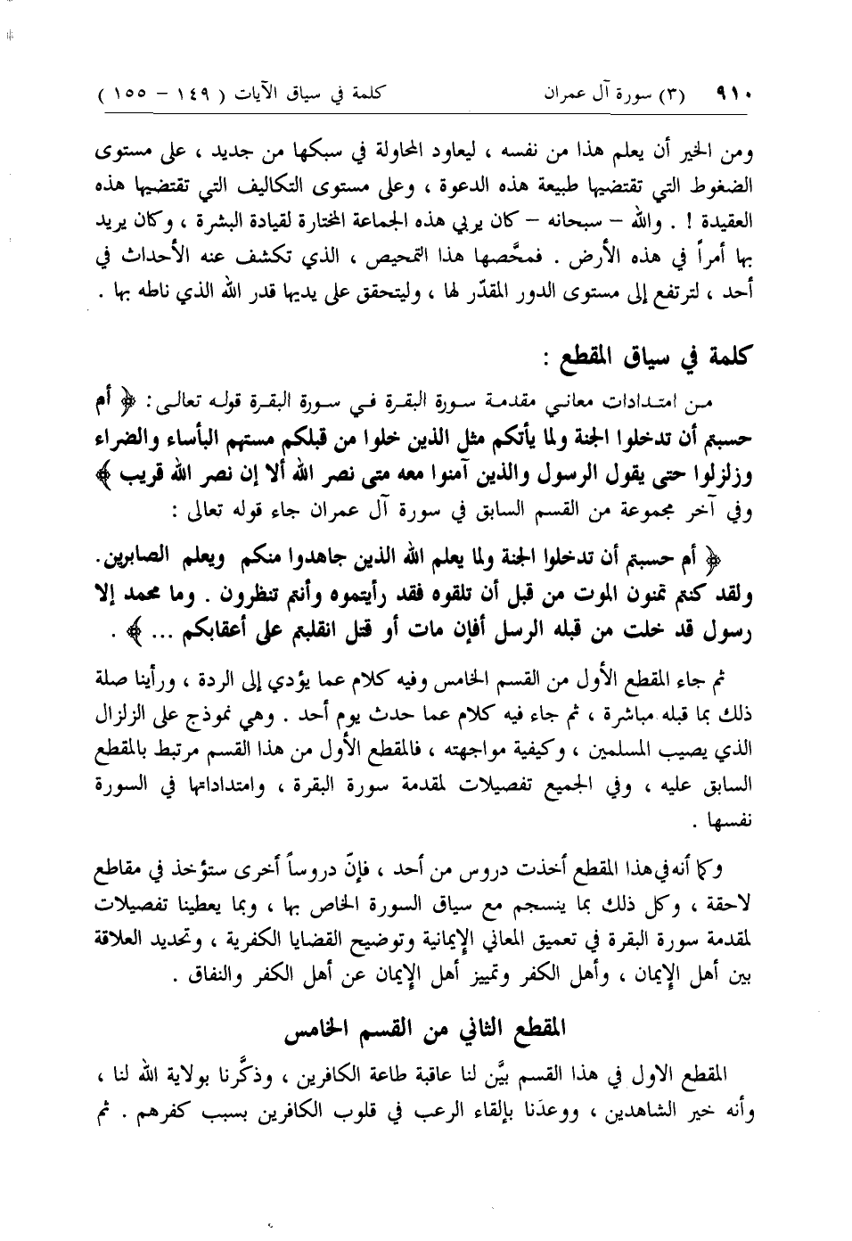 ثم جاء المقطع الأول من القسم الخامس وفيه كلام عما يؤدي إلى الردة، ورأينا صلة ذلك بما قبله مباشرة، ثم جاء فيه كلام عما حدث يوم أحد. وهي نموذج على الزلزال الذي يصيب المسلمين، وكيفية مواجهته، فالمقطع الأول من هذا القسم مرتبط بالمقطع السابق عليه، وفي الجميع تفصيلات لمقدمة سورة البقرة، وامتداداتها في السورة نفسها.