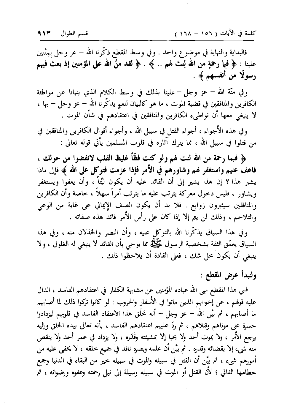 في هذا المقطع نهى الله عباده المؤمنين عن مشابهة الكفار في اعتقادهم الفاسد، الدال عليه قولهم، عن إخوانهم الذين ماتوا في الأسفار والحروب: لو كانوا تركوا ذلك لما أصابهم ما أصابهم، ثم بين الله- عزّ وجل- أنه خلق هذا الاعتقاد الفاسد في قلوبهم ليزدادوا حسرة على موتاهم وقتلاهم، ثم رد عليهم اعتقادهم الفاسد، بأنه تعالى بيده الخلق وإليه يرجع الأمر، ولا يموت أحد ولا يحيا إلا بمشيئته وقدره، ولا يزداد في عمر أحد ولا ينقص منه شئ إلا بقضائه وقدره. ثم بين أن علمه وبصره نافذ في جميع خلقه، لا يخفى عليه من أمورهم شئ، ثم بين أن القتل في سبيله والموت في سبيله خير من البقاء في الدنيا وجمع حطامها الفاني؛ لأن القتل أو الموت في سبيله وسيلة إلى نيل رحمته وعفوه ورضوانه، ثم