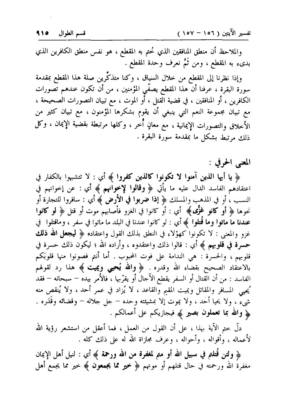 يا أَيُّهَا الَّذِينَ آمَنُوا لا تَكُونُوا كَالَّذِينَ كَفَرُوا أي: لا تتشبهوا بالكفار في اعتقادهم الفاسد الدال عليه ما يأتي وَقالُوا لِإِخْوانِهِمْ أي: عن إخوانهم في النسب، أو في المذهب والمسلك إِذا ضَرَبُوا فِي الْأَرْضِ أي: سافروا للتجارة أو نحوها أَوْ كانُوا غُزًّى أي: أو كانوا في الغزو فأصابهم موت أو قتل لَوْ كانُوا عِنْدَنا ما ماتُوا وَما قُتِلُوا أي: لو كانوا عندنا في البلد ما ماتوا في سفر، وما قتلوا في غزو والمعنى: لا تكونوا كهؤلاء في النطق بذلك القول واعتقاده لِيَجْعَلَ اللَّهُ ذلِكَ حَسْرَةً فِي قُلُوبِهِمْ أي: قالوا ذلك واعتقدوه، وأراده الله؛ ليكون ذلك حسرة في قلوبهم، والحسرة: هي الندامة على فوت المحبوب. أما أنتم فصونوا منها قلوبكم بالاعتقاد الصحيح بقضاء الله وقدره. وَاللَّهُ يُحْيِي وَيُمِيتُ هذا رد لقولهم الفاسد: من أن القتال أو السفر يقطع الآجال أو يقربها، فالأمر بيده- سبحانه- فقد يحيي المسافر والمقاتل ويميت المقيم والقاعد، لا يزاد في عمر أحد، ولا ينقص منه شئ، ولا يحيا أحد، ولا يموت إلا بمشيئته وحده- جل جلاله- وقضائه وقدره.