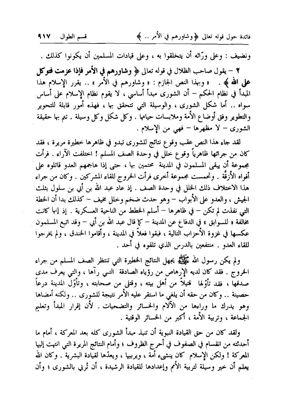 2 - يقول صاحب الظلال في قوله تعالى وَشاوِرْهُمْ فِي الْأَمْرِ فَإِذا عَزَمْتَ فَتَوَكَّلْ عَلَى اللَّهِ. «وبهذا النص الجازم: «وشاورهم في الأمر» .. يقرر الإسلام هذا المبدأ في نظام الحكم- أن الشورى مبدأ أساسي، لا يقوم نظام الإسلام على أساس سواه .. أما شكل الشورى، والوسيلة التي تتحقق بها، فهذه أمور قابلة للتحوير والتطوير وفق أوضاع الأمة وملابسات حياتها. وكل شكل وكل وسيلة. تتم بها حقيقة الشورى- لا مظهرها- فهي من الإسلام.