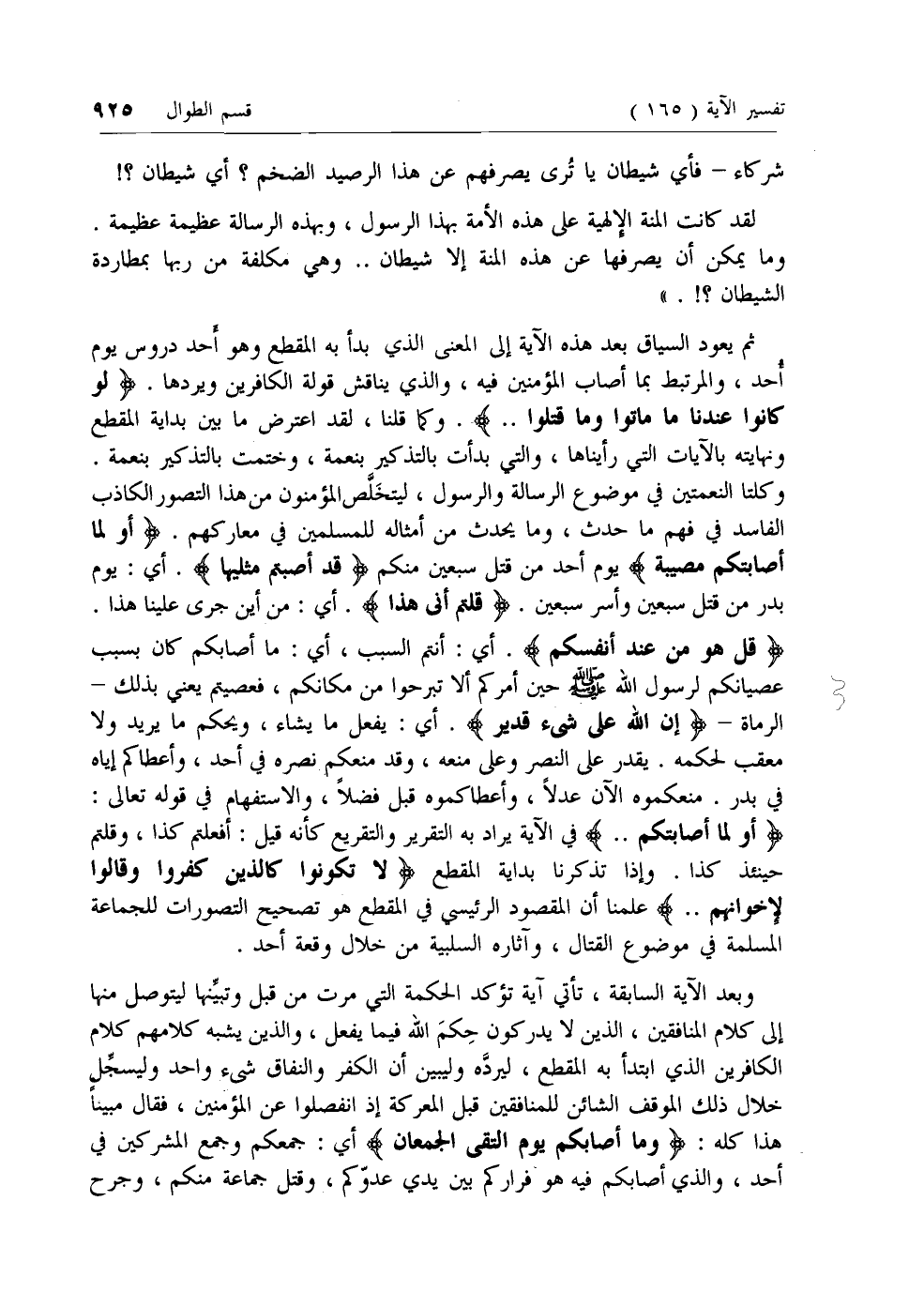 وكلتا النعمتين في موضوع الرسالة والرسول، ليتخلص المؤمنون من هذا التصور الكاذب الفاسد في فهم ما حدث، وما يحدث من أمثاله للمسلمين في معاركهم. أَوَلَمَّا أَصابَتْكُمْ مُصِيبَةٌ يوم أحد من قتل سبعين منكم قَدْ أَصَبْتُمْ مِثْلَيْها. أي: يوم بدر من قتل سبعين وأسر سبعين. قُلْتُمْ أَنَّى هذا. أي: من أين جرى علينا هذا.