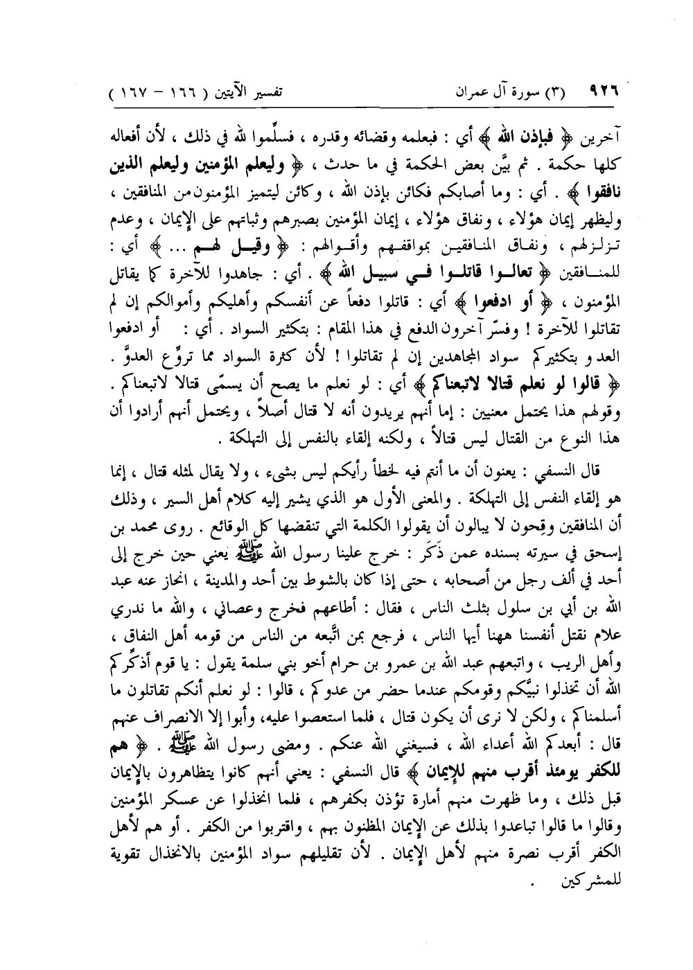 آخرين فَبِإِذْنِ اللَّهِ أي: فبعلمه وقضائه وقدره، فسلموا لله في ذلك، لأن أفعاله كلها حكمة. ثم بين بعض الحكمة في ما حدث، وَلِيَعْلَمَ الْمُؤْمِنِينَ وَلِيَعْلَمَ الَّذِينَ نافَقُوا. أي: وما أصابكم فكائن بإذن الله، وكائن ليتميز المؤمنون من المنافقين، وليظهر إيمان هؤلاء، ونفاق هؤلاء، إيمان المؤمنين بصبرهم وثباتهم على الإيمان، وعدم تزلزلهم، ونفاق المنافقين بمواقفهم وأقوالهم: وَقِيلَ لَهُمْ ... أي: