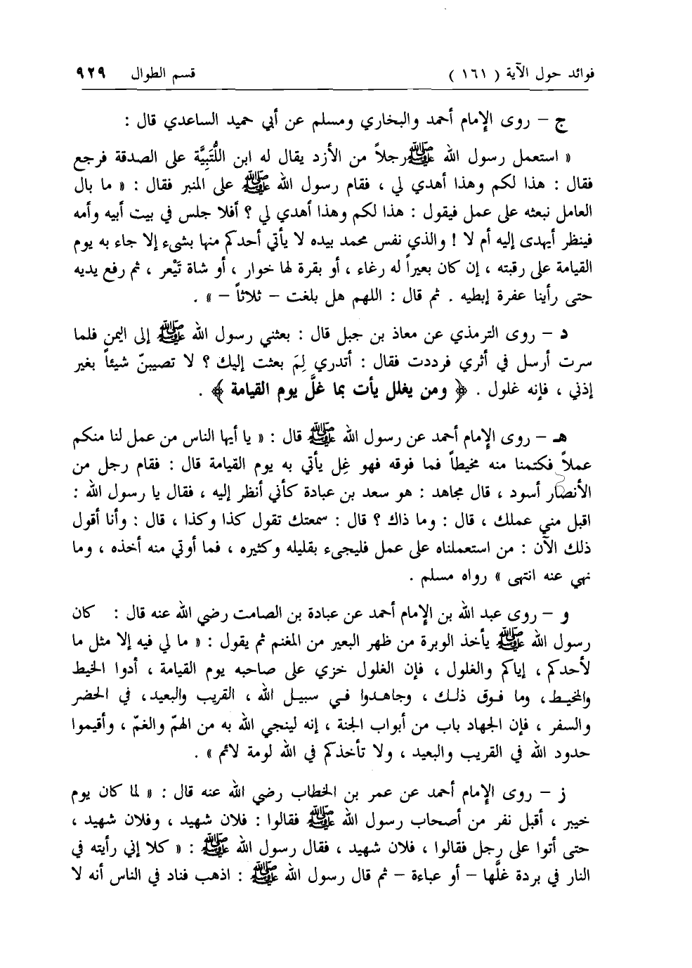 ز- روى الإمام أحمد عن عمر بن الخطاب رضي الله عنه قال: «لما كان يوم خيبر، أقبل نفر من أصحاب رسول الله صلى الله عليه وسلم فقالوا: فلان شهيد، وفلان شهيد، حتى أتوا على رجل فقالوا، فلان شهيد، فقال رسول الله صلى الله عليه وسلم: «كلا إني رأيته في النار في بردة غلها- أو عباءة- ثم قال رسول الله صلى الله عليه وسلم: اذهب فناد في الناس أنه لا