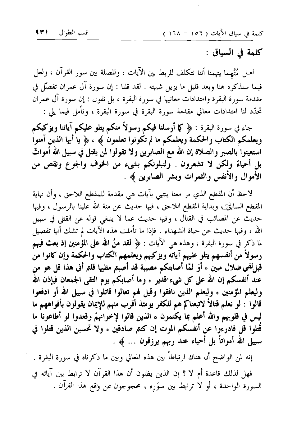 لاحظ أن المقطع الذي مر معنا ينتهي بآيات هي مقدمة للمقطع اللاحق، وأن نهاية المقطع السابق، وبداية المقطع اللاحق، فيها حديث عن منة الله علينا بالرسول، وفيها حديث عن المصائب في القتال، وفيها حديث عما لا ينبغي قوله عن القتلى في سبيل الله، وفيها حديث عن حياة الشهداء. فإذا ما تأملت هذه الآيات لم تشك أنها تفصيل لما ذكر في سورة البقرة، وهذه هي الآيات: لَقَدْ مَنَّ اللَّهُ عَلَى الْمُؤْمِنِينَ إِذْ بَعَثَ فِيهِمْ رَسُولًا مِنْ أَنْفُسِهِمْ يَتْلُوا عَلَيْهِمْ آياتِهِ وَيُزَكِّيهِمْ وَيُعَلِّمُهُمُ الْكِتابَ وَالْحِكْمَةَ وَإِنْ كانُوا مِنْ قَبْلُ لَفِي ضَلالٍ مُبِينٍ* أَوَلَمَّا أَصابَتْكُمْ مُصِيبَةٌ قَدْ أَصَبْتُمْ مِثْلَيْها قُلْتُمْ أَنَّى هذا قُلْ هُوَ مِنْ عِنْدِ أَنْفُسِكُمْ إِنَّ اللَّهَ عَلى كُلِّ شَيْءٍ قَدِيرٌ* وَما أَصابَكُمْ يَوْمَ الْتَقَى الْجَمْعانِ فَبِإِذْنِ اللَّهِ وَلِيَعْلَمَ الْمُؤْمِنِينَ* وَلِيَعْلَمَ الَّذِينَ نافَقُوا وَقِيلَ لَهُمْ تَعالَوْا قاتِلُوا فِي سَبِيلِ اللَّهِ أَوِ ادْفَعُوا قالُوا: لَوْ نَعْلَمُ قِتالًا لَاتَّبَعْناكُمْ هُمْ لِلْكُفْرِ يَوْمَئِذٍ أَقْرَبُ مِنْهُمْ لِلْإِيمانِ يَقُولُونَ بِأَفْواهِهِمْ ما لَيْسَ فِي قُلُوبِهِمْ وَاللَّهُ أَعْلَمُ بِما يَكْتُمُونَ* الَّذِينَ قالُوا لِإِخْوانِهِمْ وَقَعَدُوا لَوْ أَطاعُونا ما قُتِلُوا قُلْ فَادْرَؤُا عَنْ أَنْفُسِكُمُ الْمَوْتَ إِنْ كُنْتُمْ صادِقِينَ* وَلا تَحْسَبَنَّ الَّذِينَ قُتِلُوا فِي سَبِيلِ اللَّهِ أَمْواتاً بَلْ أَحْياءٌ عِنْدَ رَبِّهِمْ يُرْزَقُونَ ....