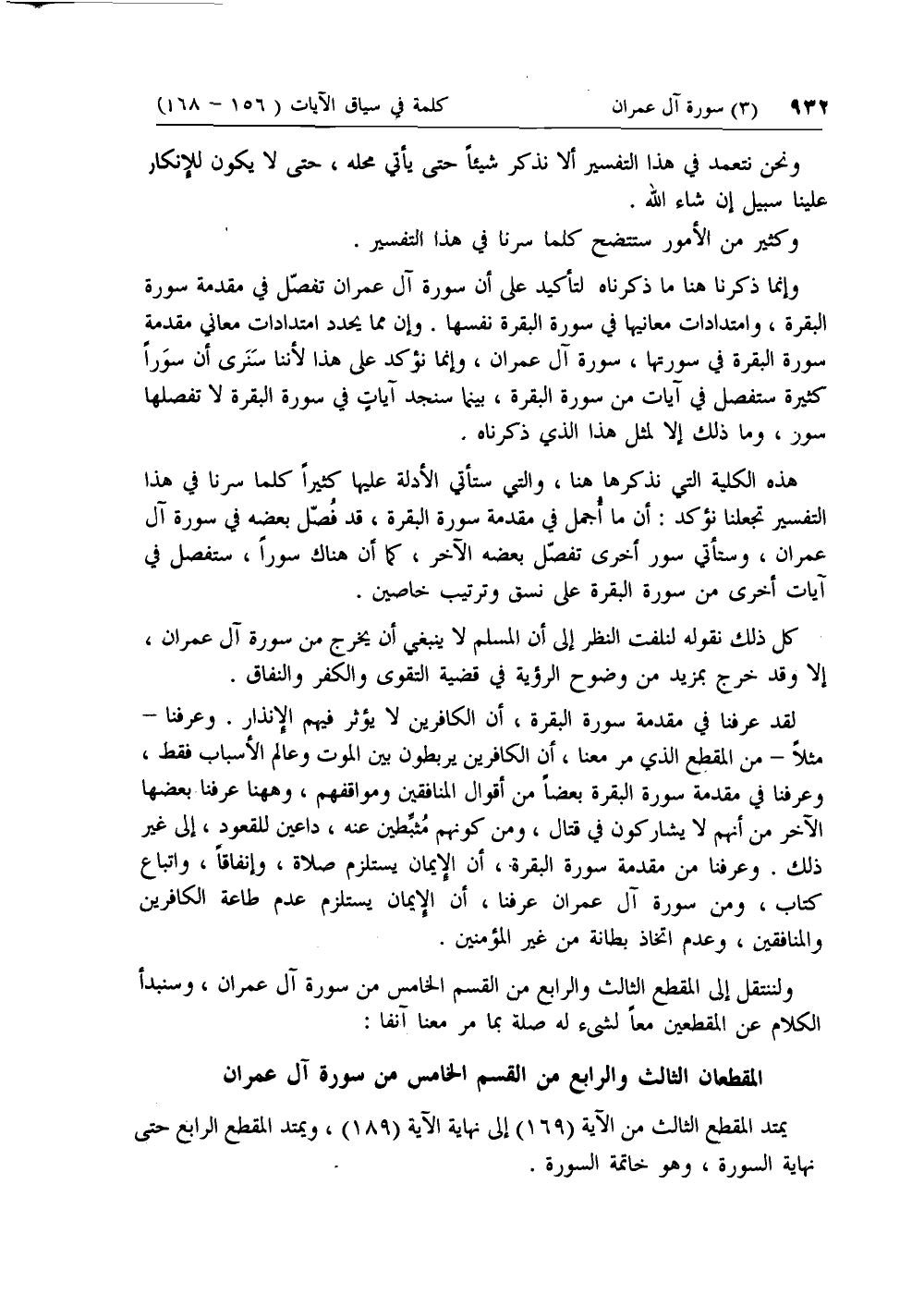 هذه الكلية التي نذكرها هنا، والتي ستأتي الأدلة عليها كثيرا كلما سرنا في هذا التفسير تجعلنا نؤكد: أن ما أجمل في مقدمة سورة البقرة، قد فصل بعضه في سورة آل عمران، وستأتي سور أخرى تفصل بعضه الآخر، كما أن هناك سورا، ستفصل في آيات أخرى من سورة البقرة على نسق وترتيب خاصين.