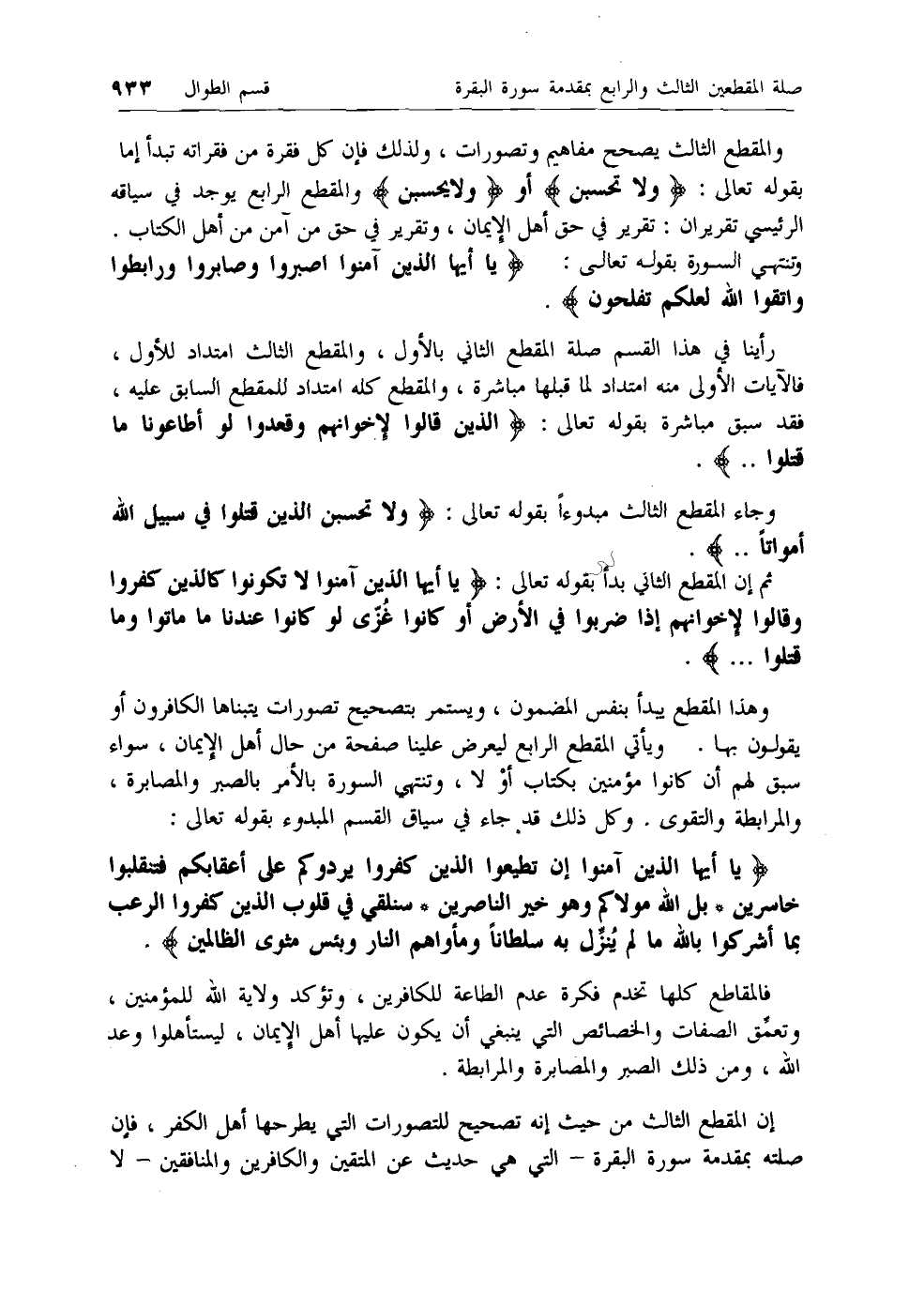رأينا في هذا القسم صلة المقطع الثاني بالأول، والمقطع الثالث امتداد للأول، فالآيات الأولى منه امتداد لما قبلها مباشرة، والمقطع كله امتداد للمقطع السابق عليه، فقد سبق مباشرة بقوله تعالى: الَّذِينَ قالُوا لِإِخْوانِهِمْ وَقَعَدُوا لَوْ أَطاعُونا ما قُتِلُوا ...