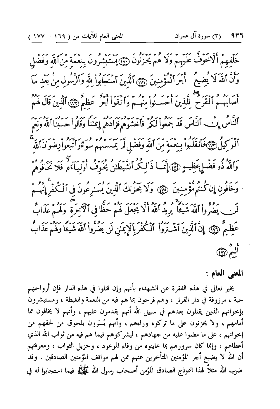 يخبر تعالى في هذه الفقرة عن الشهداء بأنهم وإن قتلوا في هذه الدار فإن أرواحهم حية، مرزوقة في دار القرار، وهم فرحون بما هم فيه من النعمة والغبطة، ومستبشرون بإخوانهم الذين يقتلون بعدهم في سبيل الله أنهم يقدمون عليهم، وأنهم لا يخافون مما أمامهم، ولا يحزنون على ما تركوه وراءهم، وأنهم يسرون بلحوق من لحقهم من إخوانهم، على ما مضوا عليه من جهادهم، ليشركوهم فيما هم فيه من ثواب الله الذي أعطاهم، وإنما كان سرورهم بما عاينوه من وفاء الموعود، وجزيل الثواب، ومعرفتهم أن الله لا يضيع أجر المؤمنين المتأخرين عنهم ممن لهم مواقف المؤمنين الصادقين. وقد ضرب الله مثلا لهذا النموذج الصادق المؤمن أصحاب رسول الله صلى الله عليه وسلم فيما استجابوا له في