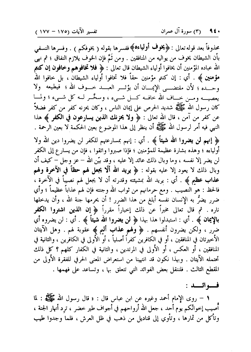 ثم قال تعالى مخبرا عن ذلك إخبارا مقررا إِنَّ الَّذِينَ اشْتَرَوُا الْكُفْرَ بِالْإِيْمانِ. أي: استبدلوا هذا بهذا لَنْ يَضُرُّوا اللَّهَ شَيْئاً. أي: لن يضروه أي ضرر، ولكن يضرون أنفسهم. وَلَهُمْ عَذابٌ أَلِيمٌ عقوبة لهم. وهل الآيتان الأخيرتان في المنافقين، أو في الكافرين كفرا أصليا، أو الأولى في الكافرين، والثانية في المنافقين، أو العكس، أو الأولى في المرتدين، والثانية في الكفار كلهم؟ كل ذلك تحتمله الآيتان. وبهذا نكون قد انتهينا من استعراض المعنى الحرفي للفقرة الأولى من المقطع الثالث. فلننقل بعض الفوائد التي تتعلق بها، وتساعد على فهمها.