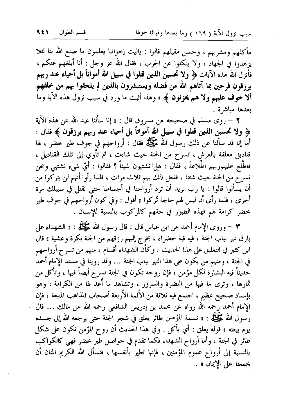 مأكلهم ومشربهم، وحسن مقيلهم قالوا: يا ليت إخواننا يعلمون ما صنع الله بنا لئلا يزهدوا في الجهاد، ولا ينكلوا عن الحرب، فقال الله عزّ وجل: أنا أبلغهم عنكم، فأنزل الله هذه الآيات وَلا تَحْسَبَنَّ الَّذِينَ قُتِلُوا فِي سَبِيلِ اللَّهِ أَمْواتاً بَلْ أَحْياءٌ عِنْدَ رَبِّهِمْ يُرْزَقُونَ فَرِحِينَ بِما آتاهُمُ اللَّهُ مِنْ فَضْلِهِ وَيَسْتَبْشِرُونَ بِالَّذِينَ لَمْ يَلْحَقُوا بِهِمْ مِنْ خَلْفِهِمْ أَلَّا خَوْفٌ عَلَيْهِمْ وَلا هُمْ يَحْزَنُونَ» وهذا أثبت ما ورد في سبب نزول هذه الآية وما بعدها مباشرة.