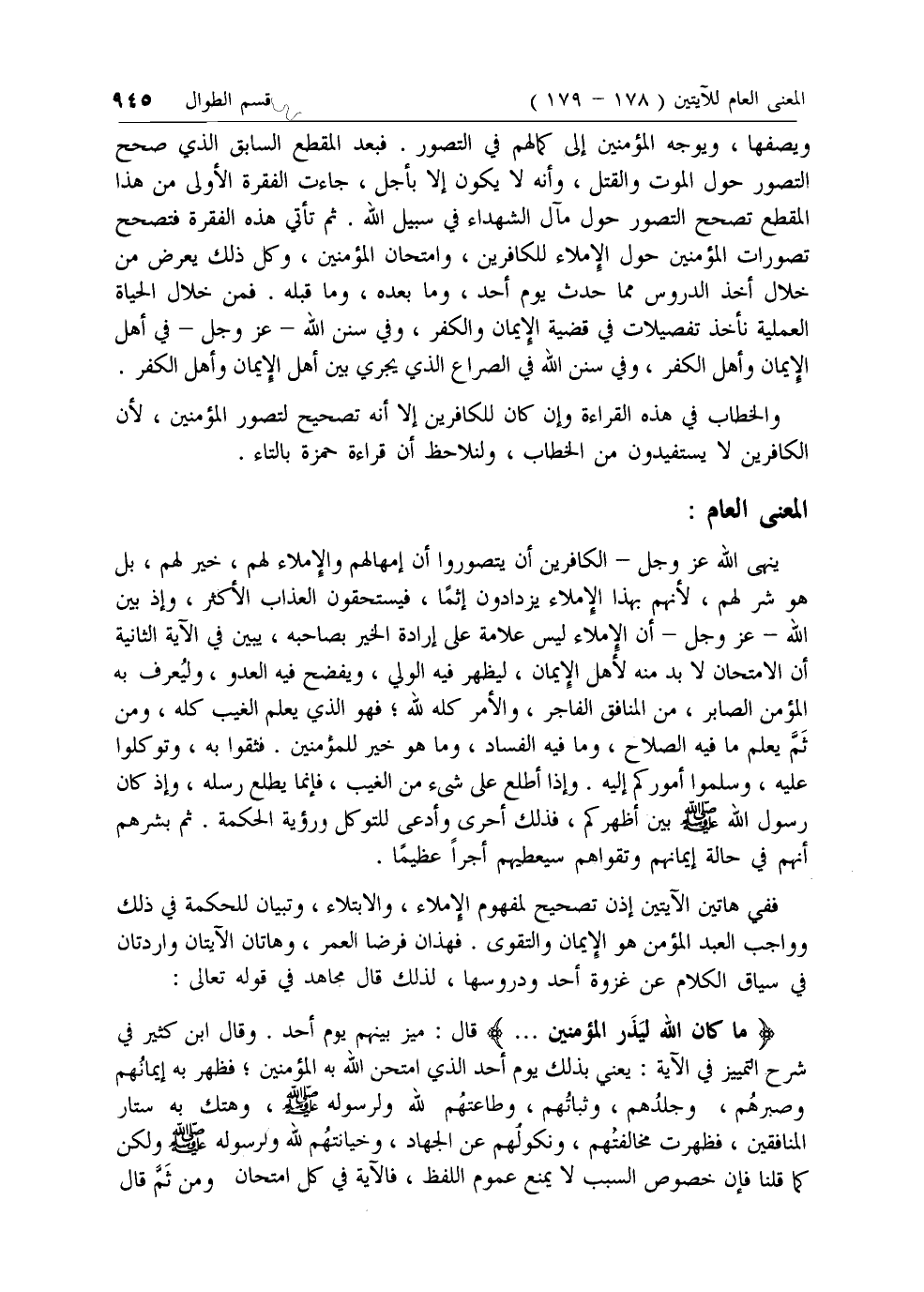 ويصفها، ويوجه المؤمنين إلى كمالهم في التصور. فبعد المقطع السابق الذي صحح التصور حول الموت والقتل، وأنه لا يكون إلا بأجل، جاءت الفقرة الأولى من هذا المقطع تصحح التصور حول مآل الشهداء في سبيل الله. ثم تأتي هذه الفقرة فتصحح تصورات المؤمنين حول الإملاء للكافرين، وامتحان المؤمنين، وكل ذلك يعرض من خلال أخذ الدروس مما حدث يوم أحد، وما بعده، وما قبله. فمن خلال الحياة العملية نأخذ تفصيلات في قضية الإيمان والكفر، وفي سنن الله- عزّ وجل- في أهل الإيمان