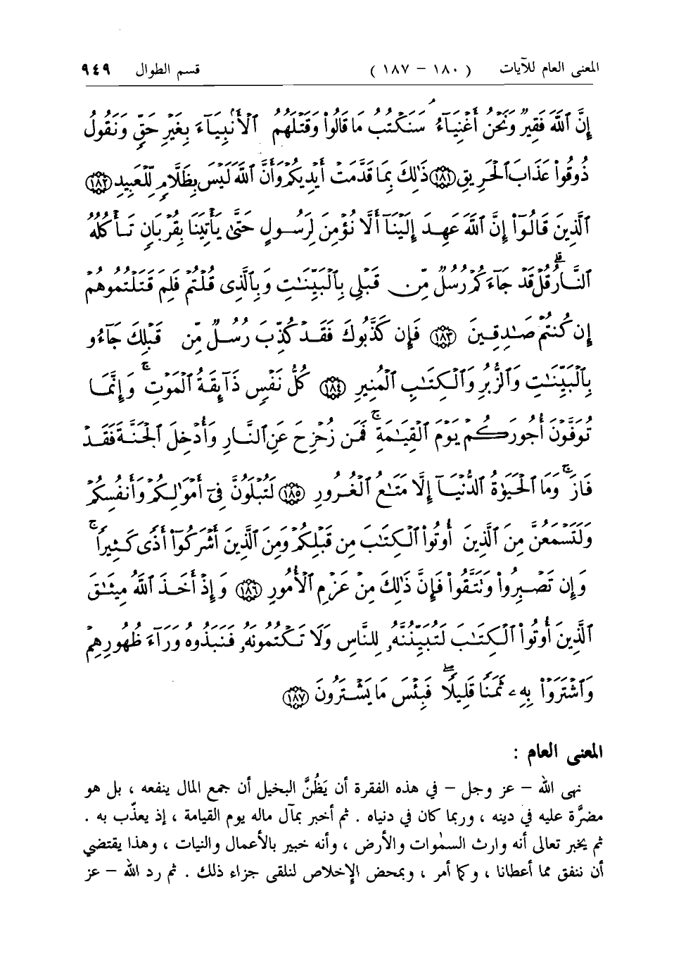 لَقَدْ سَمِعَ اللَّهُ قَوْلَ الَّذِينَ قالُوا إِنَّ اللَّهَ فَقِيرٌ وَنَحْنُ أَغْنِياءُ سَنَكْتُبُ ما قالُوا وَقَتْلَهُمُ الْأَنْبِياءَ بِغَيْرِ حَقٍّ وَنَقُولُ ذُوقُوا عَذابَ الْحَرِيقِ (181) ذلِكَ بِما قَدَّمَتْ أَيْدِيكُمْ وَأَنَّ اللَّهَ لَيْسَ بِظَلاَّمٍ لِلْعَبِيدِ (182) الَّذِينَ قالُوا إِنَّ اللَّهَ عَهِدَ إِلَيْنا أَلاَّ نُؤْمِنَ لِرَسُولٍ حَتَّى يَأْتِيَنا بِقُرْبانٍ تَأْكُلُهُ النَّارُ قُلْ قَدْ جاءَكُمْ رُسُلٌ مِنْ قَبْلِي بِالْبَيِّناتِ وَبِالَّذِي قُلْتُمْ فَلِمَ قَتَلْتُمُوهُمْ إِنْ كُنْتُمْ صادِقِينَ (183) فَإِنْ كَذَّبُوكَ فَقَدْ كُذِّبَ رُسُلٌ مِنْ قَبْلِكَ جاؤُ بِالْبَيِّناتِ وَالزُّبُرِ وَالْكِتابِ الْمُنِيرِ (184) كُلُّ نَفْسٍ ذائِقَةُ الْمَوْتِ وَإِنَّما تُوَفَّوْنَ أُجُورَكُمْ يَوْمَ الْقِيامَةِ فَمَنْ زُحْزِحَ عَنِ النَّارِ وَأُدْخِلَ الْجَنَّةَ فَقَدْ فازَ وَمَا الْحَياةُ الدُّنْيا إِلاَّ مَتاعُ الْغُرُورِ (185)
