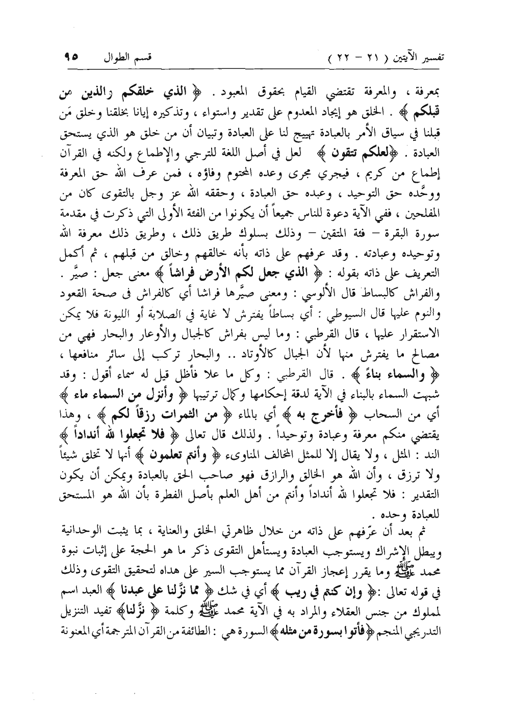 بمعرفة، والمعرفة تقتضي القيام بحقوق المعبود. الَّذِي خَلَقَكُمْ وَالَّذِينَ مِنْ قَبْلِكُمْ. الخلق هو إيجاد المعدوم على تقدير واستواء، وتذكيره إيانا بخلقنا وخلق من قبلنا في سياق الأمر بالعبادة تهييج لنا على العبادة وتبيان أن من خلق هو الذي يستحق العبادة. لَعَلَّكُمْ تَتَّقُونَ لعل في أصل اللغة للترجي والإطماع ولكنه في القرآن إطماع من كريم، فيجري مجرى وعده المحتوم وفاؤه، فمن عرف الله حق المعرفة ووحده حق التوحيد، وعبده حق العبادة، وحققه الله عزّ وجل بالتقوى كان من المفلحين، ففي الآية دعوة للناس جميعا أن يكونوا من الفئة الأولى التي ذكرت في مقدمة سورة البقرة- فئة المتقين- وذلك بسلوك طريق ذلك، وطريق ذلك معرفة الله وتوحيده وعبادته. وقد عرفهم على ذاته بأنه خالقهم وخالق من قبلهم،