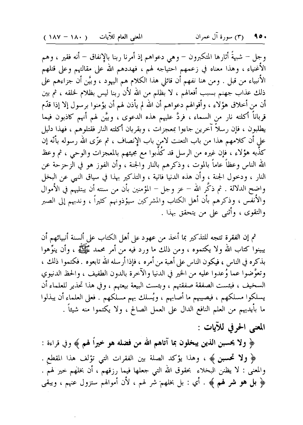 وجل- شبهة أثارها المتكبرون- وهي دعواهم إذ أمرنا ربنا بالإنفاق- أنه فقير، وهم الأغنياء، وهذا معناه في زعمهم احتياجه لهم، فهددهم الله على مقالتهم وعلى قتلهم الأنبياء من قبل. ومن هنا نفهم أن قائلي هذا الكلام هم اليهود، وبين أن جزاءهم على ذلك عذاب جهنم بسبب أفعالهم، لا بظلم من الله لأن ربنا ليس بظلام لخلقه، ثم بين أن من أخلاق هؤلاء، وأقوالهم دعواهم أن الله لم يأذن لهم أن يؤمنوا برسول إلا إذا قدم قربانا أكلته نار من السماء، فرد عليهم هذه الدعوى، وبين لهم أنهم كاذبون فيما يطلبون، فإن رسلا آخرين جاءوا بمعجزات، وبقربان أكلته النار فقتلوهم، فهذا دليل على أن كلامهم هذا من باب التعنت لا من باب الإنصاف، ثم عزى الله رسوله بأنه إن كذبه هؤلاء، فإن غيره من الرسل قد كذبوا مع مجيئهم بالمعجزات والوحي، ثم وعظ الله الناس وعظا عاما بالموت، وذكرهم بالنار والجنة، وأن الفوز هو في الزحزحة عن النار، ودخول الجنة، وأن هذه الدنيا فانية، والتذكير بهذا في سياق النهي عن البخل واضح الدلالة. ثم ذكر الله- عزّ وجل- المؤمنين بأن من سنته أن