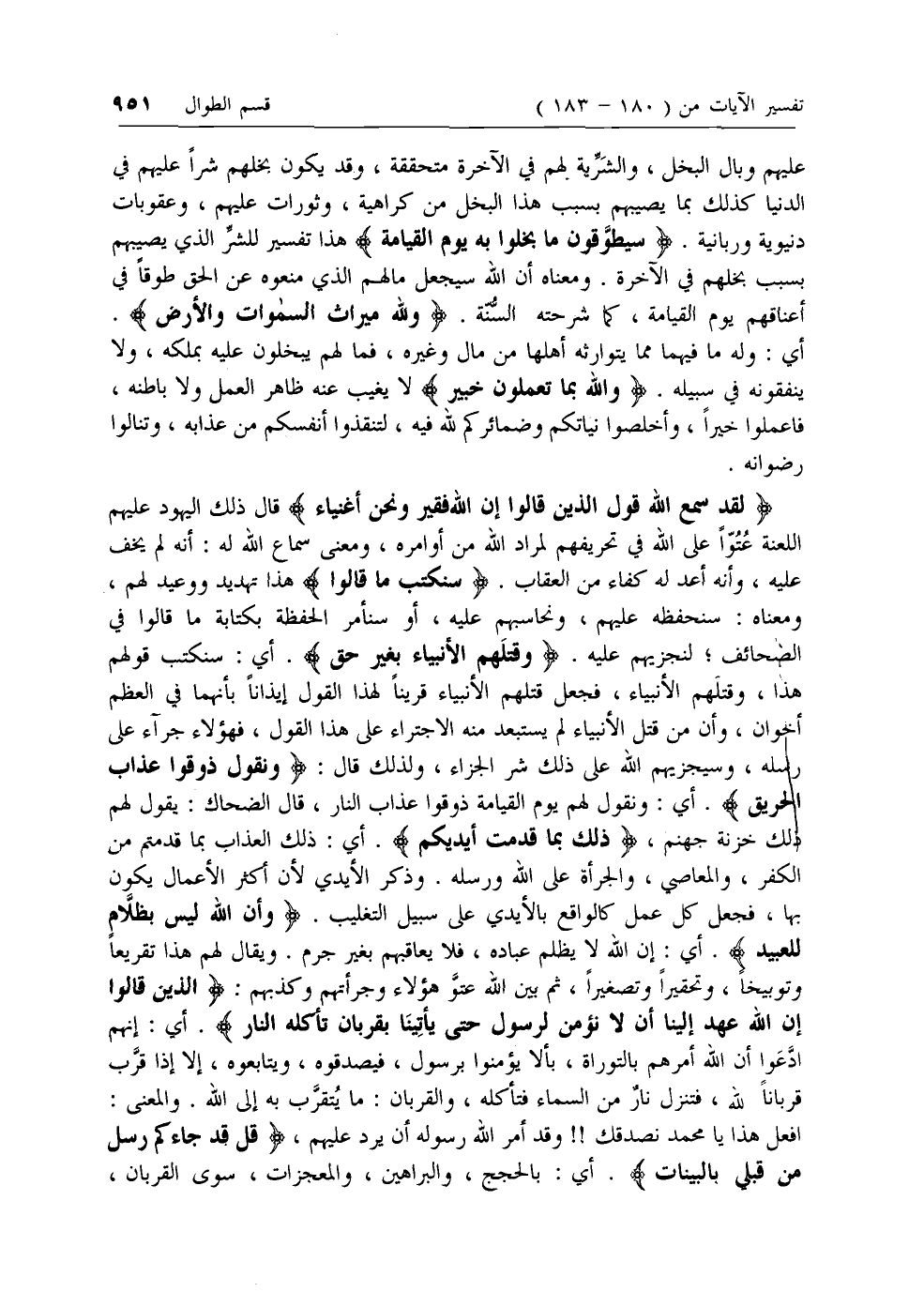 لَقَدْ سَمِعَ اللَّهُ قَوْلَ الَّذِينَ قالُوا إِنَّ اللَّهَ فَقِيرٌ وَنَحْنُ أَغْنِياءُ قال ذلك اليهود عليهم اللعنة عتوا على الله في تحريفهم لمراد الله من أوامره، ومعنى سماع الله له: أنه لم يخف عليه، وأنه أعد له كفاء من العقاب. سَنَكْتُبُ ما قالُوا هذا تهديد ووعيد لهم، ومعناه: سنحفظه عليهم، ونحاسبهم عليه، أو سنأمر الحفظة بكتابة ما قالوا في الصحائف؛ لنجزيهم عليه. وَقَتْلَهُمُ الْأَنْبِياءَ بِغَيْرِ حَقٍّ. أي: سنكتب قولهم هذا، وقتلهم الأنبياء، فجعل قتلهم الأنبياء قرينا لهذا القول إيذانا بأنهما في العظم أخوان، وأن من قتل الأنبياء لم يستبعد منه الاجتراء على هذا القول، فهؤلاء جرآء على رسله، وسيجزيهم الله على ذلك شر الجزاء، ولذلك قال: وَنَقُولُ ذُوقُوا عَذابَ الْحَرِيقِ. أي: ونقول لهم يوم القيامة ذوقوا عذاب النار، قال الضحاك: يقول لهم ذلك خزنة جهنم،