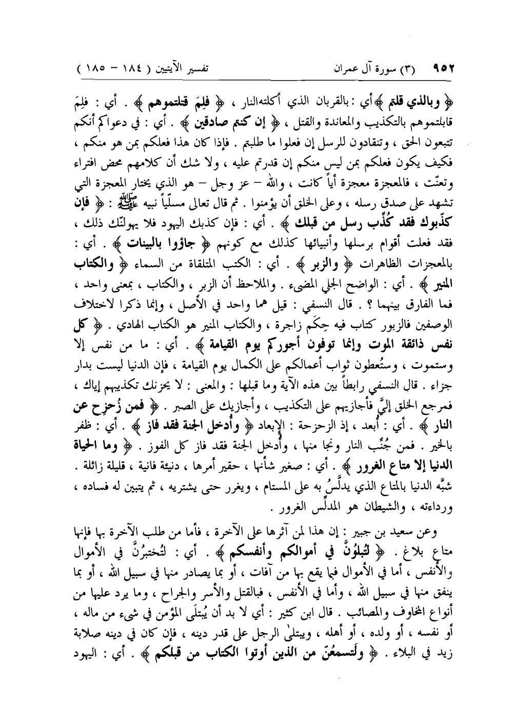 بالمعجزات الظاهرات وَالزُّبُرِ. أي: الكتب المتلقاة من السماء وَالْكِتابِ الْمُنِيرِ. أي: الواضح الجلي المضئ. والملاحظ أن الزبر، والكتاب، بمعنى واحد، فما الفارق بينهما؟. قال النسفي: قيل هما واحد في الأصل، وإنما ذكرا لاختلاف الوصفين فالزبور كتاب فيه حكم زاجرة، والكتاب المنير هو الكتاب الهادي.