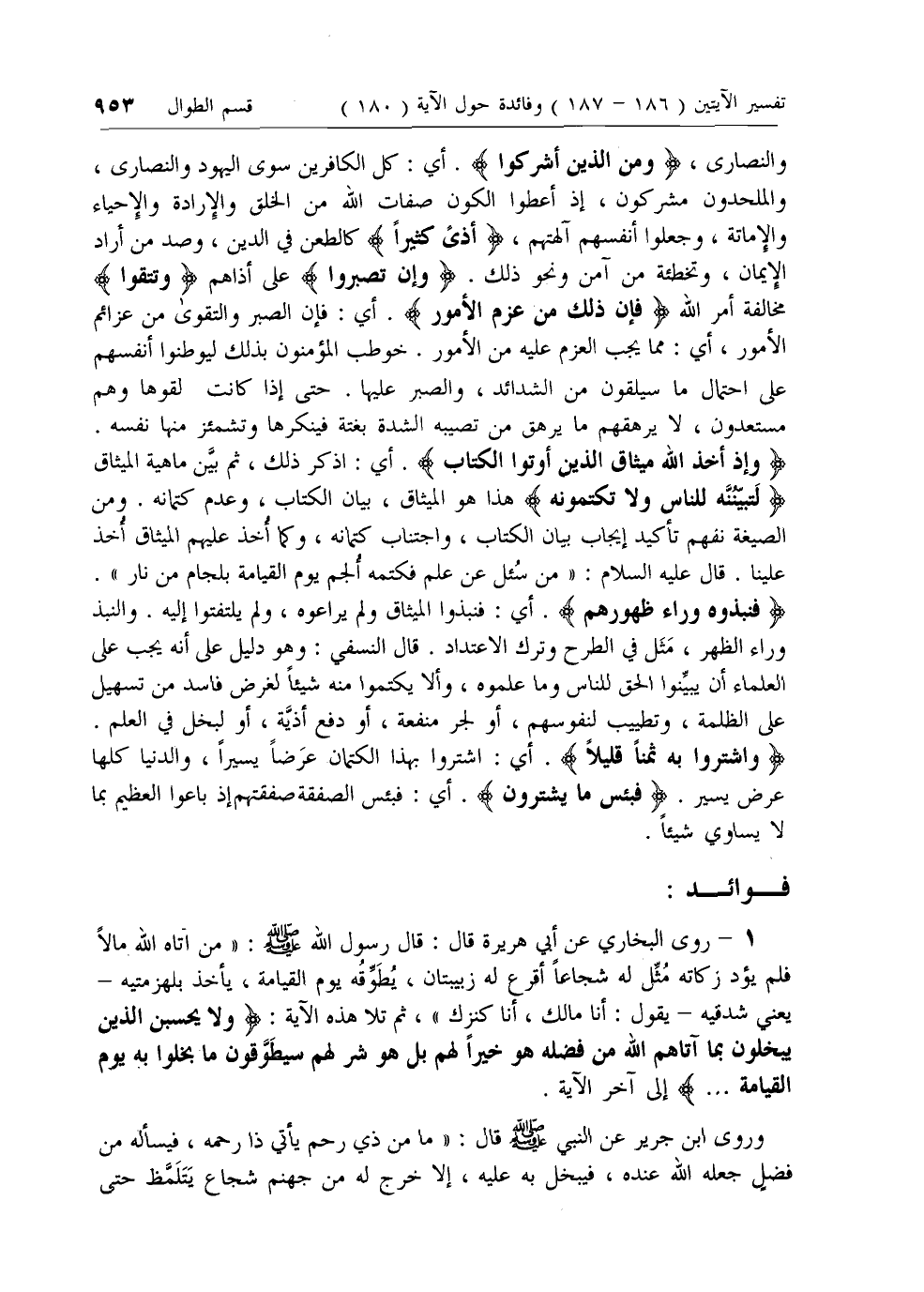والنصارى، وَمِنَ الَّذِينَ أَشْرَكُوا. أي: كل الكافرين سوى اليهود والنصارى، والملحدون مشركون، إذ أعطوا الكون صفات الله من الخلق والإرادة والإحياء والإماتة، وجعلوا أنفسهم آلهتهم، أَذىً كَثِيراً كالطعن في الدين، وصد من أراد الإيمان، وتخطئة من آمن ونحو ذلك. وَإِنْ تَصْبِرُوا على أذاهم وَتَتَّقُوا مخالفة أمر الله فَإِنَّ ذلِكَ مِنْ عَزْمِ الْأُمُورِ. أي: فإن الصبر والتقوى من عزائم الأمور، أي: مما يجب العزم عليه من الأمور. خوطب المؤمنون بذلك ليوطنوا أنفسهم على احتمال ما سيلقون من الشدائد، والصبر عليها. حتى إذا كانت لقوها وهم مستعدون، لا يرهقهم ما يرهق من تصيبه الشدة بغتة فينكرها وتشمئز منها نفسه.