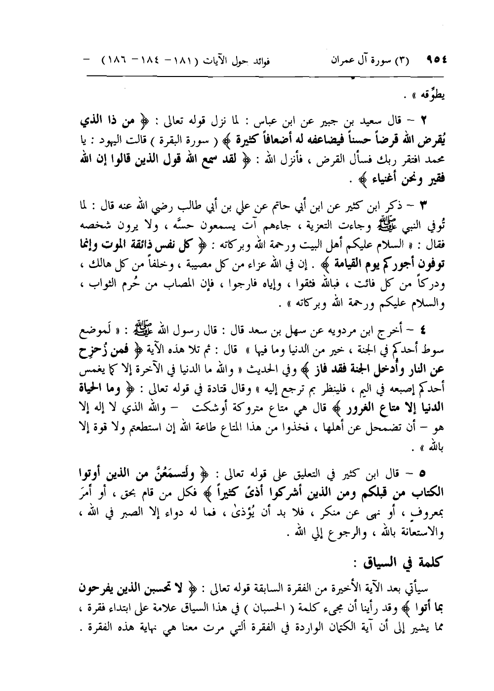 4 - أخرج ابن مردويه عن سهل بن سعد قال: قال رسول الله صلى الله عليه وسلم: «لموضع سوط أحدكم في الجنة، خير من الدنيا وما فيها» قال: ثم تلا هذه الآية فَمَنْ زُحْزِحَ عَنِ النَّارِ وَأُدْخِلَ الْجَنَّةَ فَقَدْ فازَ وفي الحديث «والله ما الدنيا في الآخرة إلا كما يغمس أحدكم إصبعه في اليم، فلينظر بم ترجع إليه» وقال قتادة في قوله تعالى: وَمَا الْحَياةُ الدُّنْيا إِلَّا مَتاعُ الْغُرُورِ قال هي متاع متروكة أو شكت- والله الذي لا إله إلا هو- أن تضمحل عن أهلها، فخذوا من هذا المتاع طاعة الله إن استطعتم ولا قوة إلا بالله».