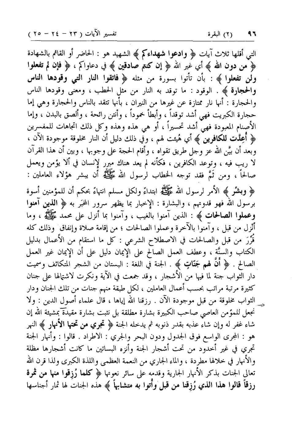 وَبَشِّرِ الأمر لرسول الله صلى الله عليه وسلم ابتداء ولكل مسلم انتهاء بحكم أن للمؤمنين أسوة برسول الله فهو قدوتهم، والبشارة: الإخبار بما يظهر سرور المخبر به الَّذِينَ آمَنُوا وَعَمِلُوا الصَّالِحاتِ: الذين آمنوا بالغيب، وآمنوا بما أنزل على محمد صلى الله عليه وسلم، وما أنزل من قبل، وآمنوا بالآخرة وعملوا الصالحات؛ من إقامة صلاة وإنفاق وذلك كله قرر من قبل والصالحات في الاصطلاح الشرعي: كل ما استقام من الأعمال بدليل الكتاب والسنة، وعطف العمل الصالح على الإيمان دليل على أن الإيمان غير العمل الصالح. أَنَّ لَهُمْ جَنَّاتٍ. الجنة في اللغة: البستان من الشجر المتكاثف وسميت دار الثواب جنة لما فيها من الأشجار، وقد جمعت في الآية ونكرت لاشتمالها على جنان كثيرة مرتبة مراتب بحسب أعمال العاملين، لكل طبقة منهم جنات من تلك الجنان ودار الثواب مخلوقة من قبل موجودة الآن. رزقنا الله إياها، قال علماء أصول الدين: ولا نجعل للمؤمن العاصي صاحب الكبيرة بشارة مطلقة بل نثبت بشارة مقيدة بمشيئة الله إن شاء غفر له وإن شاء عذبه بقدر ذنوبه ثم يدخله الجنة تَجْرِي مِنْ تَحْتِهَا الْأَنْهارُ النهر هو: المجرى الواسع فوق الجدول ودون البحر والجري: الاطراد. قالوا: وأنهار الجنة تجري في غير أخدود من تحت أشجار الجنة وأنزه البساتين ما كانت أشجارها مظلة والأنهار في خلالها مطردة، والماء الجاري من النعمة العظمى واللذة الكبرى ولذا قرن الله تعالى الجنات بذكر الأنهار الجارية وقدمه على سائر نعوتها كُلَّما رُزِقُوا مِنْها مِنْ ثَمَرَةٍ رِزْقاً قالُوا هذَا الَّذِي رُزِقْنا مِنْ قَبْلُ وَأُتُوا بِهِ مُتَشابِهاً هذه الجنات لها ثمار أجناسها