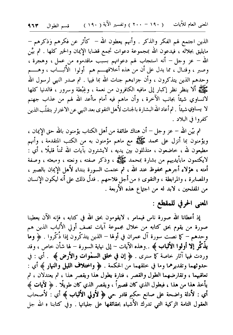 إذ أعطانا الله صورة ناس فيما مر، لا يقومون بحق الله في كتابه، فإنه الآن يعطينا صورة من يقوم بحق كتابه من خلال مجموعة آيات تصف أولي الألباب الذين هم وحدهم- كما نصت سورة آل عمران في أولها- الذين يتذكرون إذا ذكروا. وَما يَذَّكَّرُ إِلَّا أُولُوا الْأَلْبابِ. وهذه الآيات- إلى نهاية السورة- لها شأن خاص، وقد وردت فيها آثار خاصة كما سنرى. إِنَّ فِي خَلْقِ السَّماواتِ وَالْأَرْضِ. أي: في حدوثهما وتقديرهما وما في خلقهما من الحكمة. وَاخْتِلافِ اللَّيْلِ وَالنَّهارِ أي: