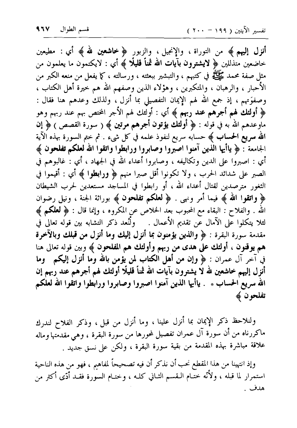 لحرب الشيطان وَاتَّقُوا اللَّهَ فيما أمر ونهى. لَعَلَّكُمْ تُفْلِحُونَ بوراثة الجنة، ونيل رضوان الله. والفلاح: البقاء مع المحبوب بعد الخلاص عن المكروه، وإنما قال: لَعَلَّكُمْ لئلا يتكلوا على الآمال عن تقديم الأعمال. ولنعد ذكر التشابه بين قوله تعالى في مقدمة سورة البقرة: وَالَّذِينَ يُؤْمِنُونَ بِما أُنْزِلَ إِلَيْكَ وَما أُنْزِلَ مِنْ قَبْلِكَ وَبِالْآخِرَةِ هُمْ يُوقِنُونَ، أُولئِكَ عَلى هُدىً مِنْ رَبِّهِمْ وَأُولئِكَ هُمُ الْمُفْلِحُونَ وبين قوله تعالى هنا في آخر آل عمران: وَإِنَّ مِنْ أَهْلِ الْكِتابِ لَمَنْ يُؤْمِنُ بِاللَّهِ وَما أُنْزِلَ إِلَيْكُمْ وَما أُنْزِلَ إِلَيْهِمْ خاشِعِينَ لِلَّهِ لا يَشْتَرُونَ بِآياتِ اللَّهِ ثَمَناً قَلِيلًا أُولئِكَ لَهُمْ أَجْرُهُمْ عِنْدَ رَبِّهِمْ إِنَّ اللَّهَ سَرِيعُ الْحِسابِ*. يا أَيُّهَا الَّذِينَ آمَنُوا اصْبِرُوا وَصابِرُوا وَرابِطُوا وَاتَّقُوا اللَّهَ لَعَلَّكُمْ تُفْلِحُونَ
