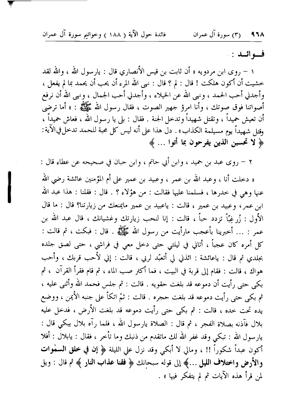 يا رسول الله: تبكي وقد غفر الله لك ما تقدم من ذنبك وما تأخر، فقال: يا بلال: أفلا أكون عبدا شكورا!!، وما لي لا أبكي وقد نزل علي الليلة إِنَّ فِي خَلْقِ السَّماواتِ وَالْأَرْضِ وَاخْتِلافِ اللَّيْلِ ... إلى قوله سبحانك فَقِنا عَذابَ النَّارِ ثم قال: ويل لمن قرأ هذه الآيات ثم لم يتفكر فيها».