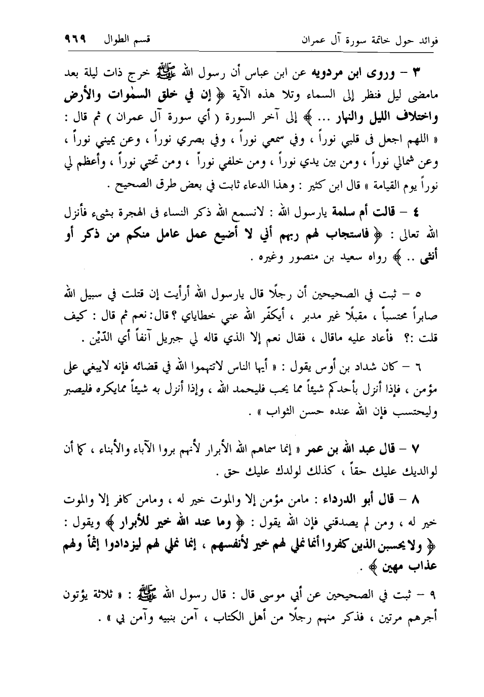 3 - وروى ابن مردويه عن ابن عباس أن رسول الله صلى الله عليه وسلم خرج ذات ليلة بعد ما مضى ليل فنظر إلى السماء وتلا هذه الآية إِنَّ فِي خَلْقِ السَّماواتِ وَالْأَرْضِ وَاخْتِلافِ اللَّيْلِ وَالنَّهارِ ... إلى آخر السورة (أي سورة آل عمران) ثم قال:
