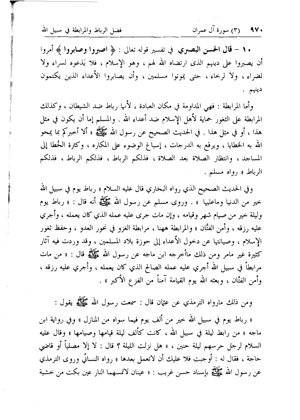 10 - قال الحسن البصري في تفسير قوله تعالى: اصْبِرُوا وَصابِرُوا أمروا أن يصبروا على دينهم الذى ارتضاه الله لهم، وهو الإسلام، فلا يدعوه لسراء ولا لضراء، ولا لرخاء، حتى يموتوا مسلمين، وأن يصابروا الأعداء الذين يكتمون دينهم.