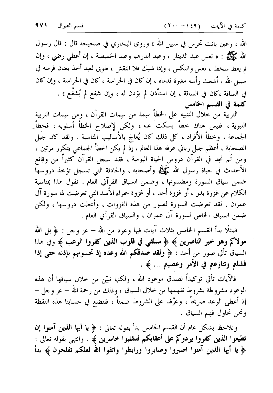 فمثلا بدأ القسم الخامس بثلاث آيات فيها وعود من الله- عزّ وجل: بَلِ اللَّهُ مَوْلاكُمْ وَهُوَ خَيْرُ النَّاصِرِينَ سَنُلْقِي فِي قُلُوبِ الَّذِينَ كَفَرُوا الرُّعْبَ وفي هذا السياق تأتي صور من أحد: وَلَقَدْ صَدَقَكُمُ اللَّهُ وَعْدَهُ إِذْ تَحُسُّونَهُمْ بِإِذْنِهِ حَتَّى إِذا فَشِلْتُمْ وَتَنازَعْتُمْ فِي الْأَمْرِ وَعَصَيْتُمْ ....