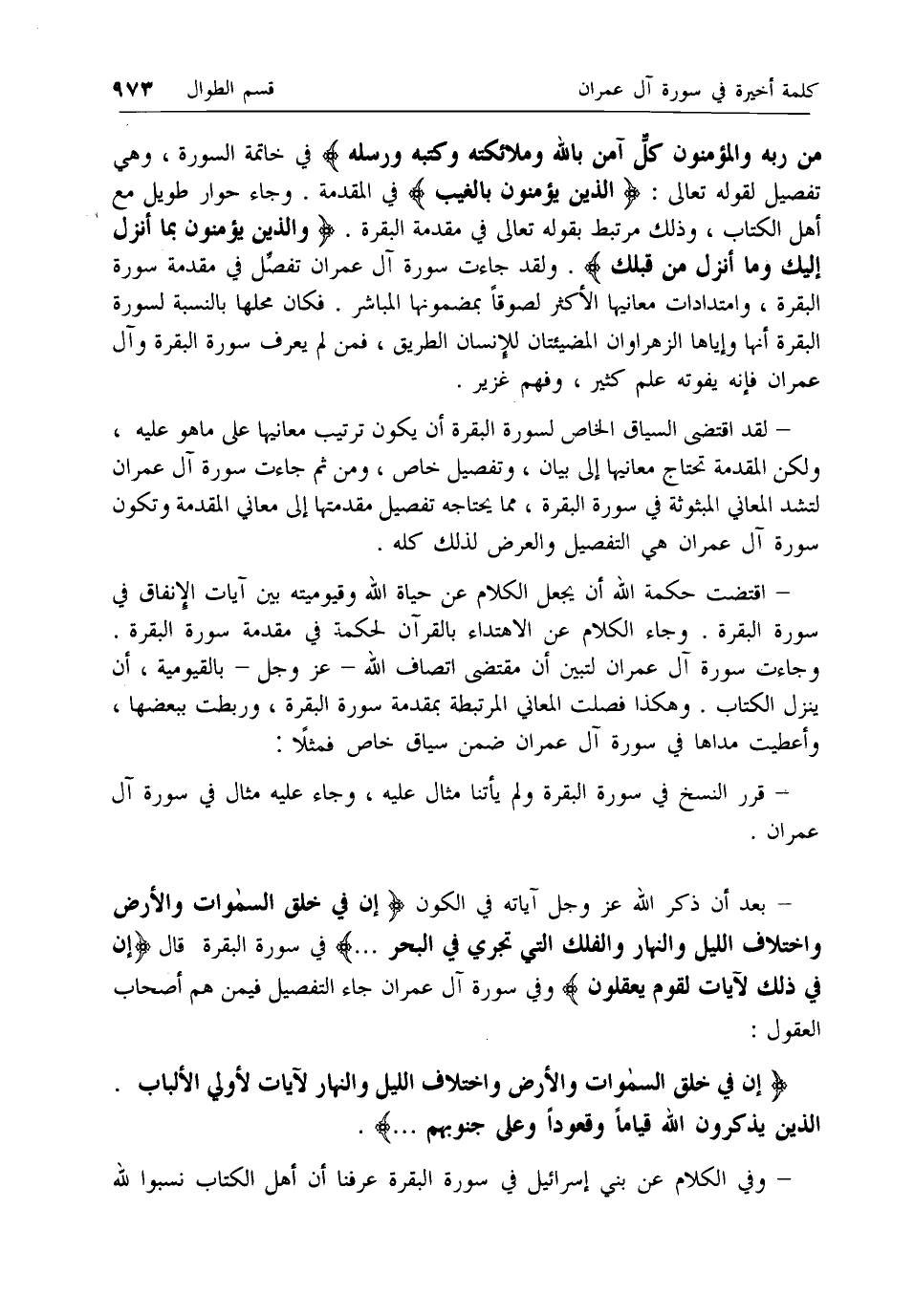 مِنْ رَبِّهِ وَالْمُؤْمِنُونَ كُلٌّ آمَنَ بِاللَّهِ وَمَلائِكَتِهِ وَكُتُبِهِ وَرُسُلِهِ في خاتمة السورة، وهي تفصيل لقوله تعالى: الَّذِينَ يُؤْمِنُونَ بِالْغَيْبِ في المقدمة. وجاء حوار طويل مع أهل الكتاب، وذلك مرتبط بقوله تعالى في مقدمة البقرة. وَالَّذِينَ يُؤْمِنُونَ بِما أُنْزِلَ إِلَيْكَ وَما أُنْزِلَ مِنْ قَبْلِكَ. ولقد جاءت سورة آل عمران تفصل في مقدمة سورة البقرة، وامتدادات معانيها الأكثر لصوقا بمضمونها المباشر. فكان محلها بالنسبة لسورة البقرة أنها وإياها الزهراوان المضيئتان للإنسان الطريق، فمن لم يعرف سورة البقرة وآل عمران فإنه يفوته علم كثير، وفهم غزير.