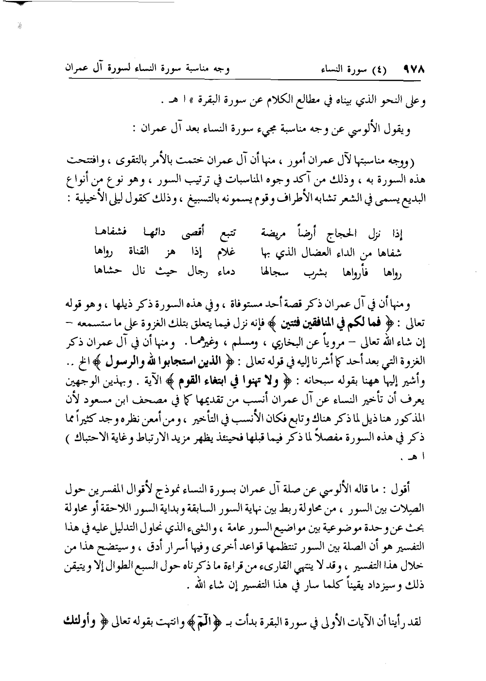 (ووجه مناسبتها لآل عمران أمور، منها أن آل عمران ختمت بالأمر بالتقوى، وافتتحت هذه السورة به، وذلك من آكد وجوه المناسبات في ترتيب السور، وهو نوع من أنواع البديع يسمى في الشعر تشابه الأطراف وقوم يسمونه بالتسبيغ، وذلك كقول ليلى الأخيلية: