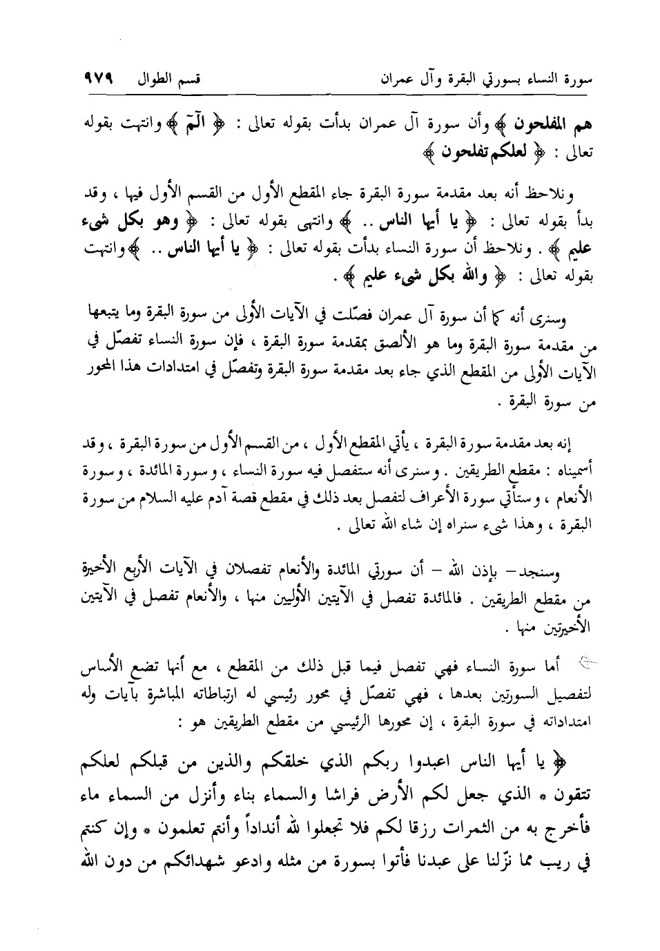 وسنرى أنه كما أن سورة آل عمران فصلت في الآيات الأولى من سورة البقرة وما يتبعها من مقدمة سورة البقرة وما هو الألصق بمقدمة سورة البقرة، فإن سورة النساء تفصل في الآيات الأولى من المقطع الذي جاء بعد مقدمة سورة البقرة وتفصل في امتدادات هذا المحور من سورة البقرة.