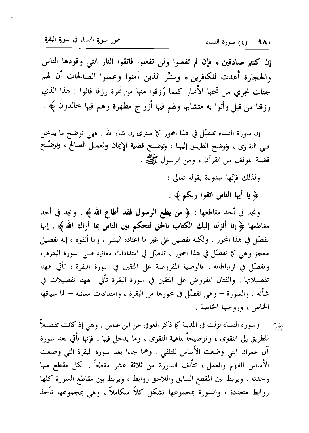 إن سورة النساء تفصل في هذا المحور كما سنرى إن شاء الله. فهي توضح ما يدخل في التقوى، وتوضح الطريق إليها، وتوضح قضية الإيمان والعمل الصالح، وتوضح قضية الموقف من القرآن، ومن الرسول صلى الله عليه وسلم.