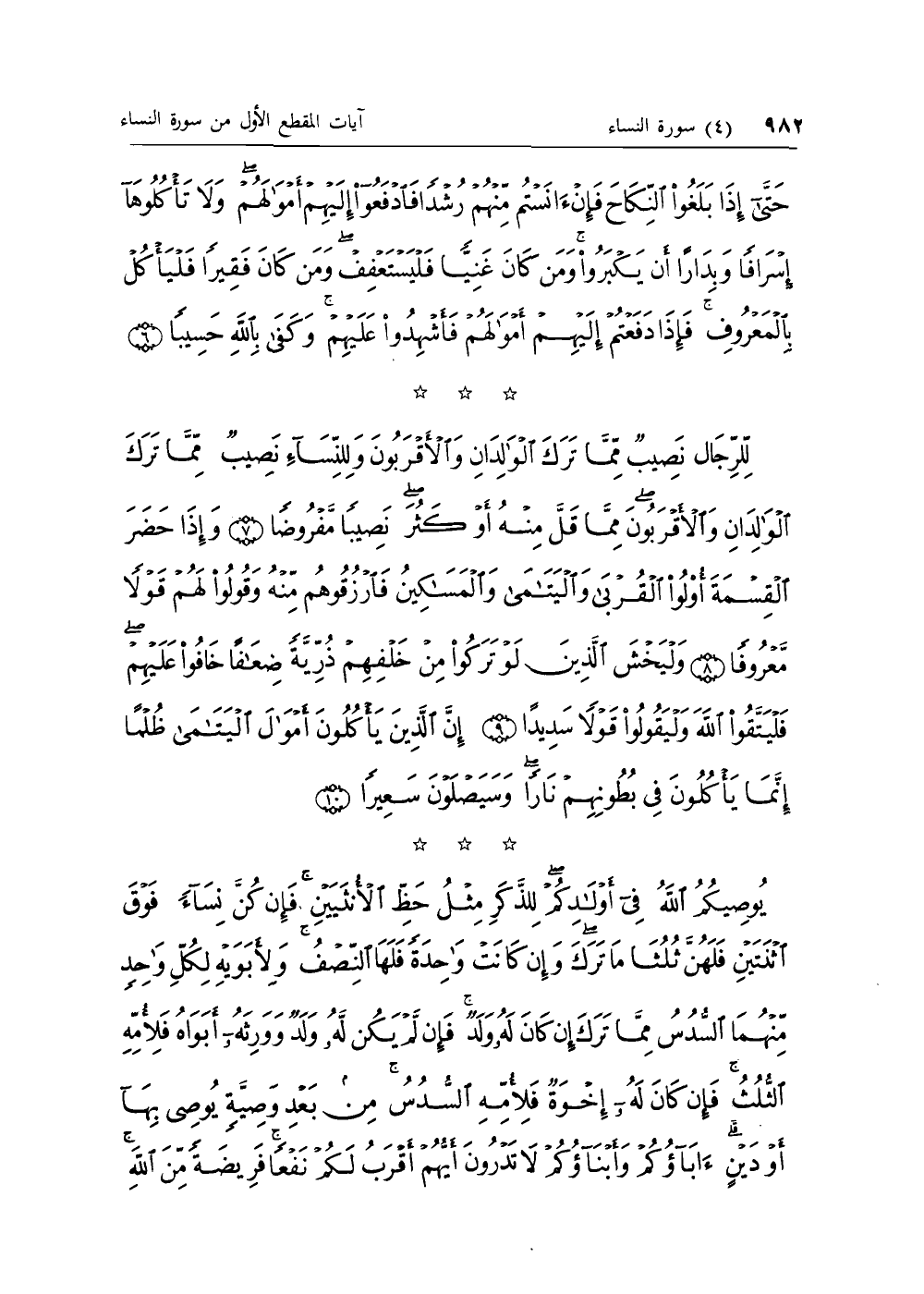 لِلرِّجالِ نَصِيبٌ مِمَّا تَرَكَ الْوالِدانِ وَالْأَقْرَبُونَ وَلِلنِّساءِ نَصِيبٌ مِمَّا تَرَكَ الْوالِدانِ وَالْأَقْرَبُونَ مِمَّا قَلَّ مِنْهُ أَوْ كَثُرَ نَصِيباً مَفْرُوضاً (7) وَإِذا حَضَرَ الْقِسْمَةَ أُولُوا الْقُرْبى وَالْيَتامى وَالْمَساكِينُ فَارْزُقُوهُمْ مِنْهُ وَقُولُوا لَهُمْ قَوْلاً مَعْرُوفاً (8) وَلْيَخْشَ الَّذِينَ لَوْ تَرَكُوا مِنْ خَلْفِهِمْ ذُرِّيَّةً ضِعافاً خافُوا عَلَيْهِمْ فَلْيَتَّقُوا اللَّهَ وَلْيَقُولُوا قَوْلاً سَدِيداً (9) إِنَّ الَّذِينَ يَأْكُلُونَ أَمْوالَ الْيَتامى ظُلْماً إِنَّما يَأْكُلُونَ فِي بُطُونِهِمْ ناراً وَسَيَصْلَوْنَ سَعِيراً (10)