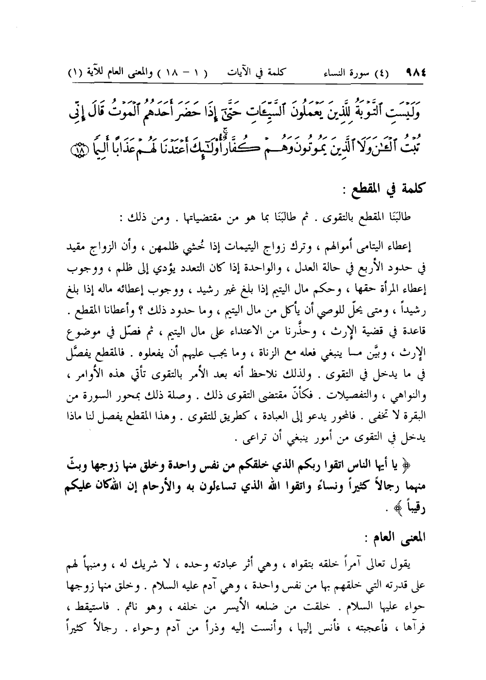 قاعدة في قضية الإرث، وحذرنا من الاعتداء على مال اليتيم، ثم فصل في موضوع الإرث، وبين ما ينبغي فعله مع الزناة، وما يجب عليهم أن يفعلوه. فالمقطع يفصل في ما يدخل في التقوى. ولذلك نلاحظ أنه بعد الأمر بالتقوى تأتي هذه الأوامر، والنواهي، والتفصيلات. فكأن مقتضى التقوى ذلك. وصلة ذلك بمحور السورة من البقرة لا تخفى. فالمحور يدعو إلى العبادة، كطريق للتقوى. وهذا المقطع يفصل لنا ماذا يدخل في التقوى من أمور ينبغي أن تراعى.